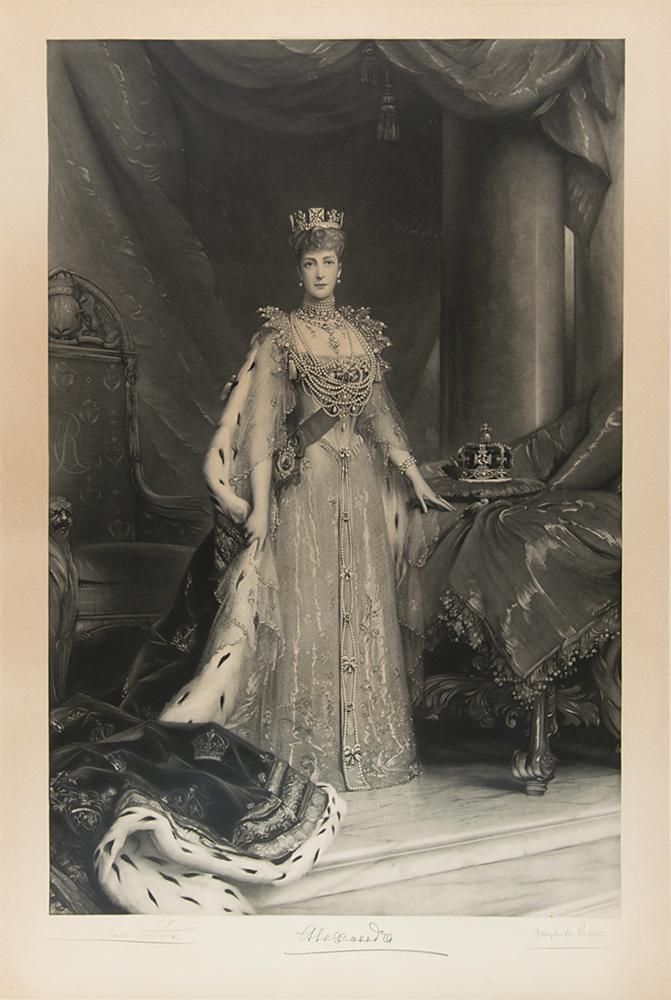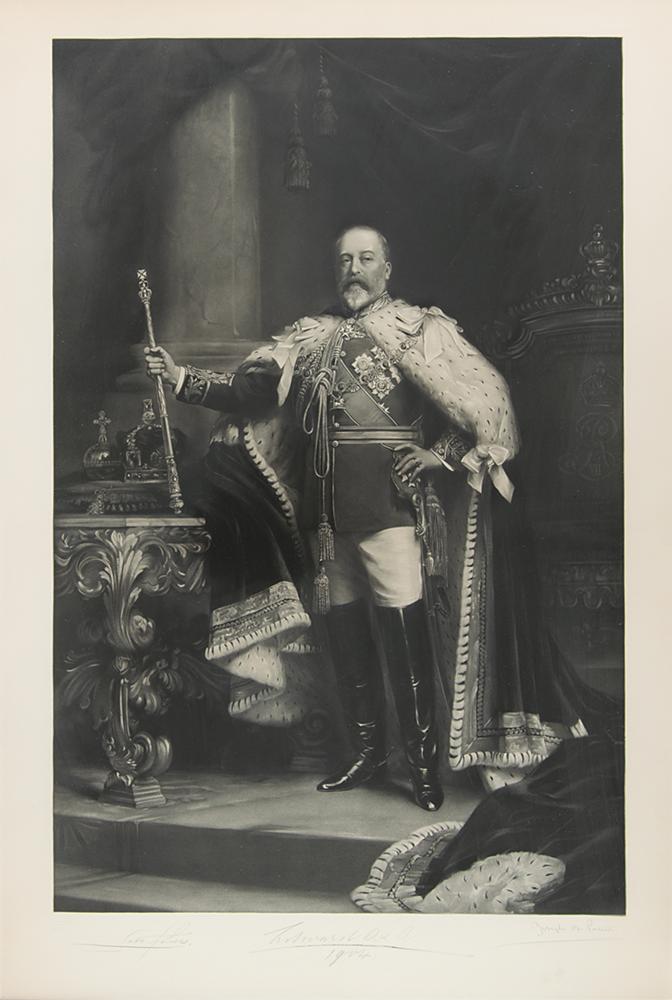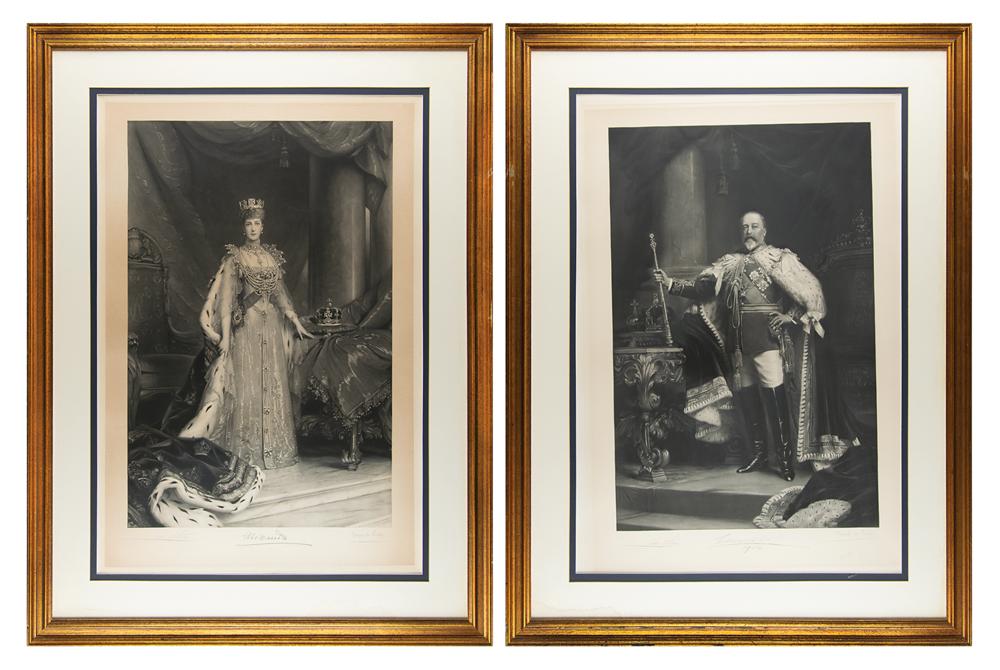 Spectacular pairing of two oversized photogravure portraits, both published by Thomas Agnew & Sons: a mammoth matte-finish 23 x 34 photogravure of an oil portrait of King Edward VII in his coronation robes by Samuel Luke Fildes, signed in the lower border in pencil by the subject, "Edward R & I, 1904," as well as the painter ("Luke Fildes") and engraver ("Joseph B. Pratt"); and a matching matte-finish 23 x 34 photogravure of an oil portrait of Queen Alexandra in her coronation robes by Samuel Luke Fildes, signed in the lower border in pencil by the subject, "Alexandra," as well as Fildes and Pratt. Each is beautifully matted and framed to an overall size of 33 x 44. In fine condition.