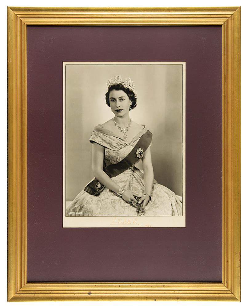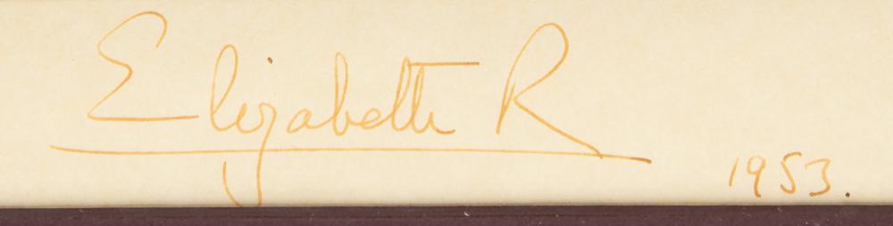 Splendid oversized vintage matte-finish 13.5 x 18 portrait of Queen Elizabeth II wearing her glimmering crown jewels, taken by Royal Court photographer Dorothy Wilding, affixed to its original 14.25 x 19.5 mount, nicely signed on the mount in fountain pen, "Elizabeth R, 1953." Archivally matted and framed to an overall size of 27 x 34.5. In fine condition. An exquisite image of the beloved British monarch.