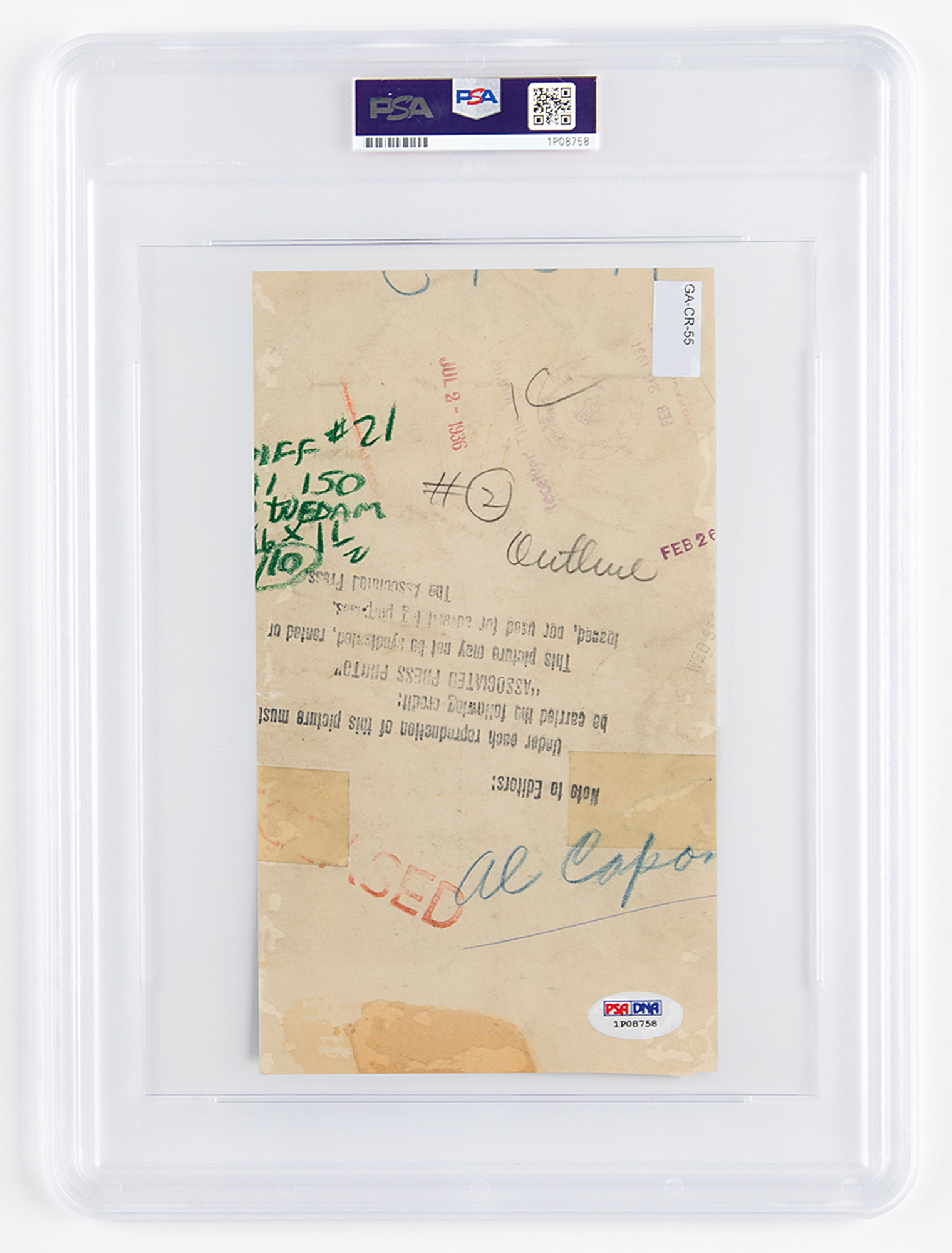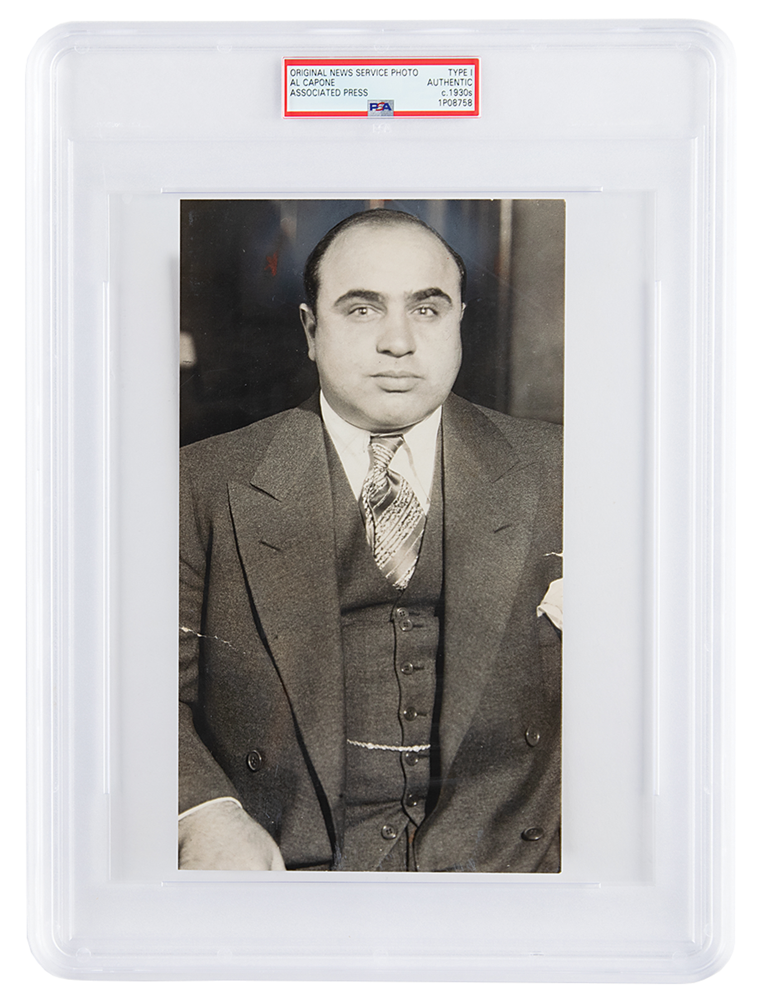 Original glossy 4.75 x 8.5 silver gelatin news service photograph of Al Capone in a half-length and front-facing pose, his glare passing just to the right of the photographer. The reverse bears pencil notations, an Associated Press photo stamp, and a few date stamps, the earliest marked to February 26, 1931. In very good condition, with evenly trimmed edges, a tape-repaired tear to the left edge, a short tear to the right edge, and a few light creases. Encapsulated by PSA as an authentic 'Type I' photograph.