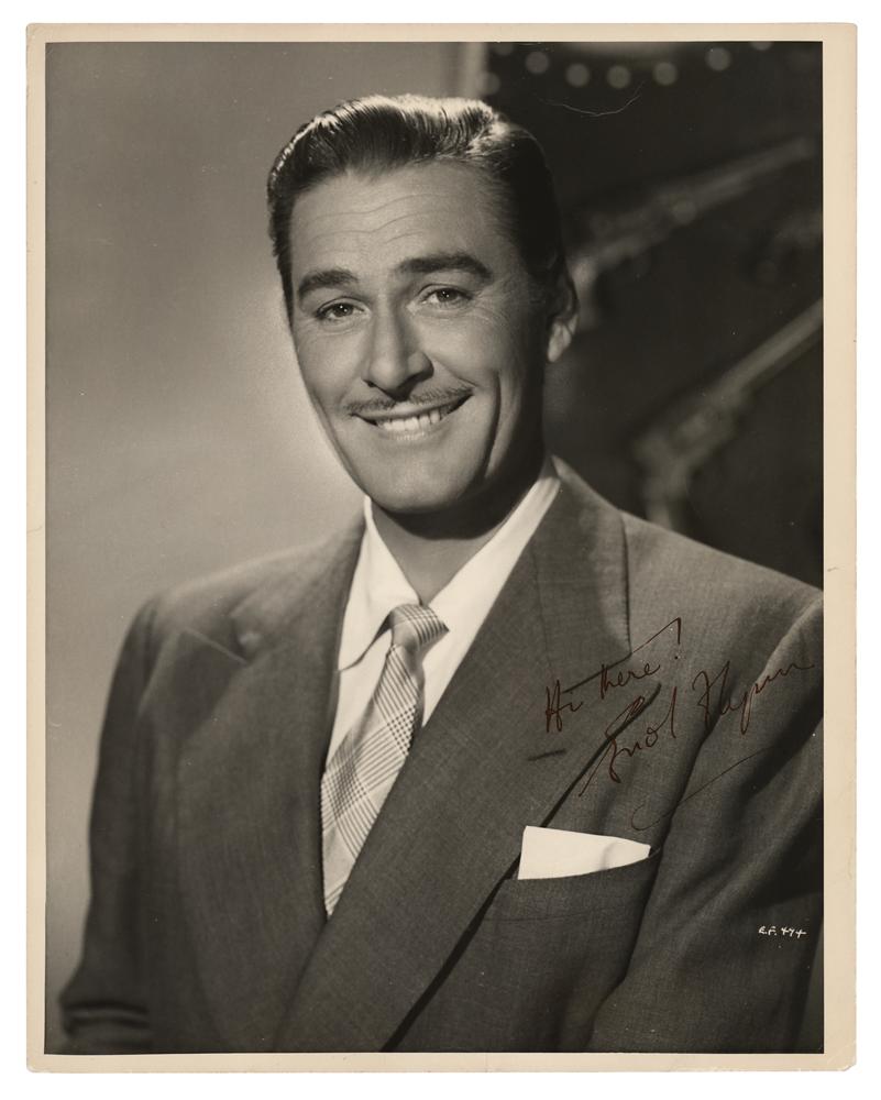 Vintage matte-finish 11 x 14 studio portrait photo of Errol Flynn wearing a suit and tie in a handsome bust-length pose, signed in fountain pen, "Hi there! Errol Flynn.” In very good to fine condition, with scattered creasing, a bit heavier in the left background area.