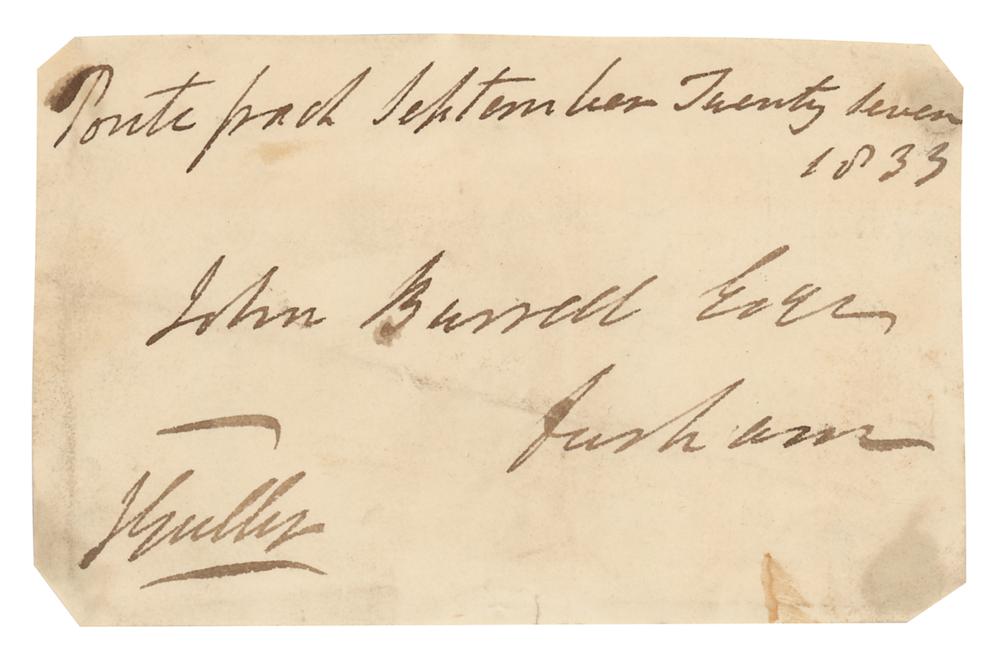 English prizefighter, horse racer, and politician (1783-1863). Hand-addressed envelope panel by John Gully, 4.75 x 3, signed in the lower left, "J. Gully," and addressed in his hand, "Pontefract September Twenty seven, 1833, John Burrell Esqr, Durham." In fine condition.