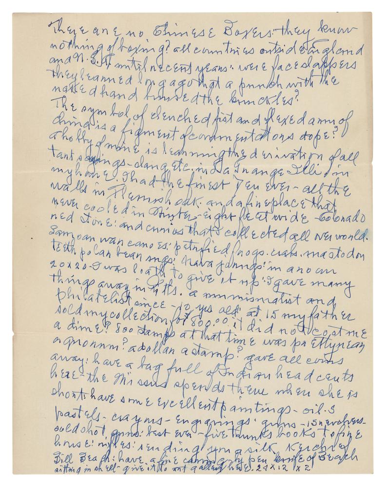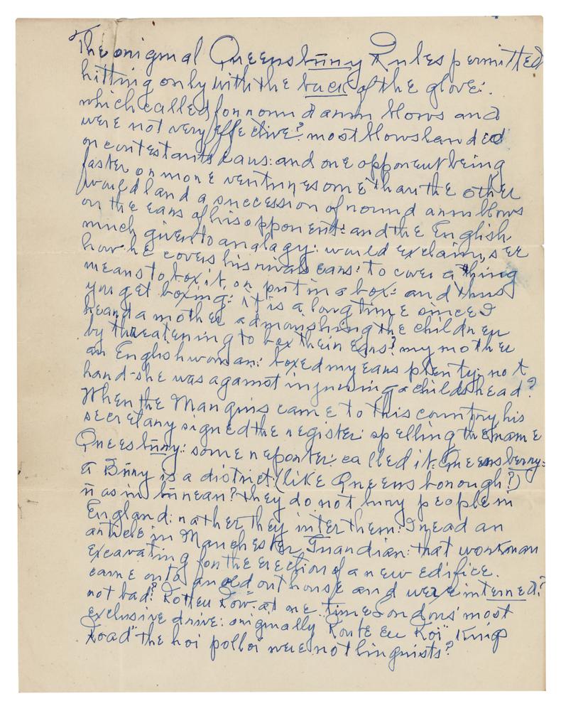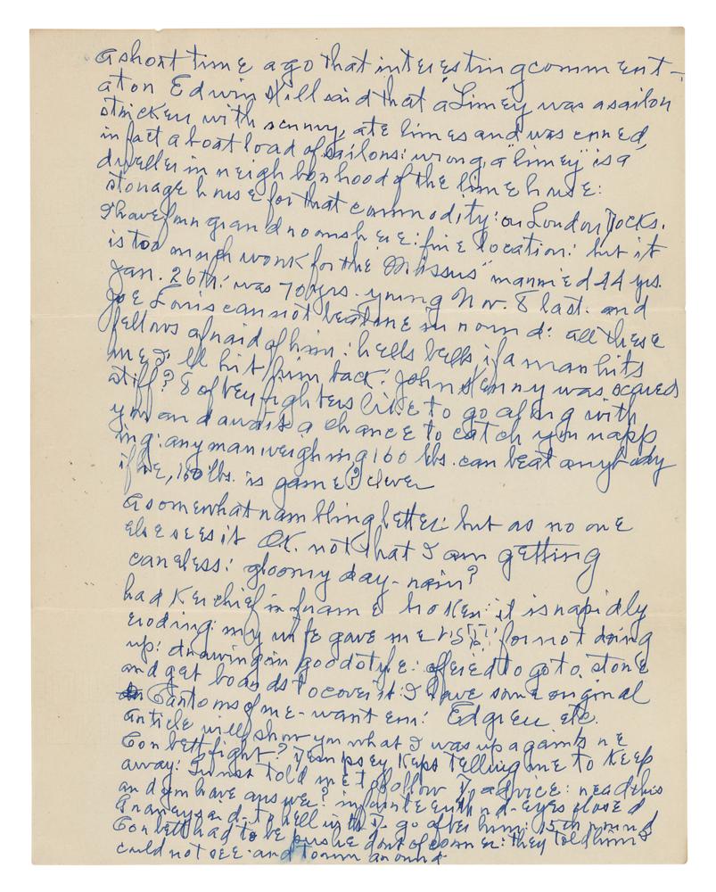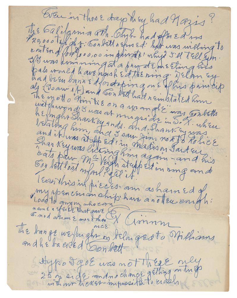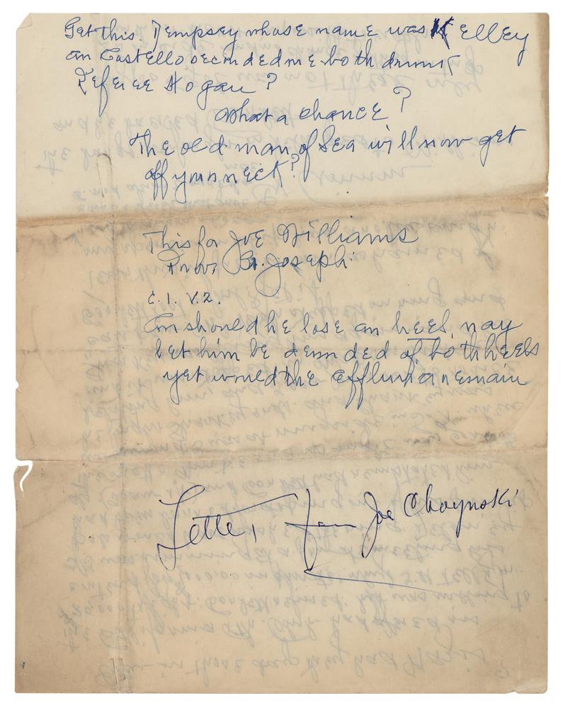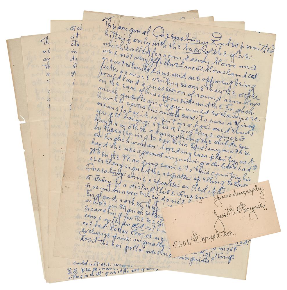 American boxer (1868-1943) who fought professionally from 1888 to 1904. ‘Chrysanthemum Joe’ weighed no more than 176 lb throughout his career, but he regularly fought heavyweights. He was considered a heavy puncher and a dangerous fighter and though he was never given an opportunity to fight for the heavyweight title, Choyinski enjoyed some stunning victories against famed heavyweights James J. Jeffries and Jack Johnson before they became champions. Two items: an ink signature, “Yours sincerely, Jos. B. Choynski, 5606 Drexel Ave.,” on an off-white 4.75 x 2.25 sheet clipped from a letter; and a handwritten manuscript penned by Joe Choynski on four off-white 8.5 x 11 sheets, unsigned, no date, which reads, in part: “The original Queensbury Rules permitted hitting only with the back of the glove, which called for round arm blows and were not very effective. Most blows landed on contestants ears, and one opponent being faster or more venturesome than the other would land a succession of round arm blows on the ears of his opponents and the English much given to analogy would exclaim: see how he covers his rivals ears, to cover a thing means to box it or put in a box, and thus you get boxing.” In overall fine condition.