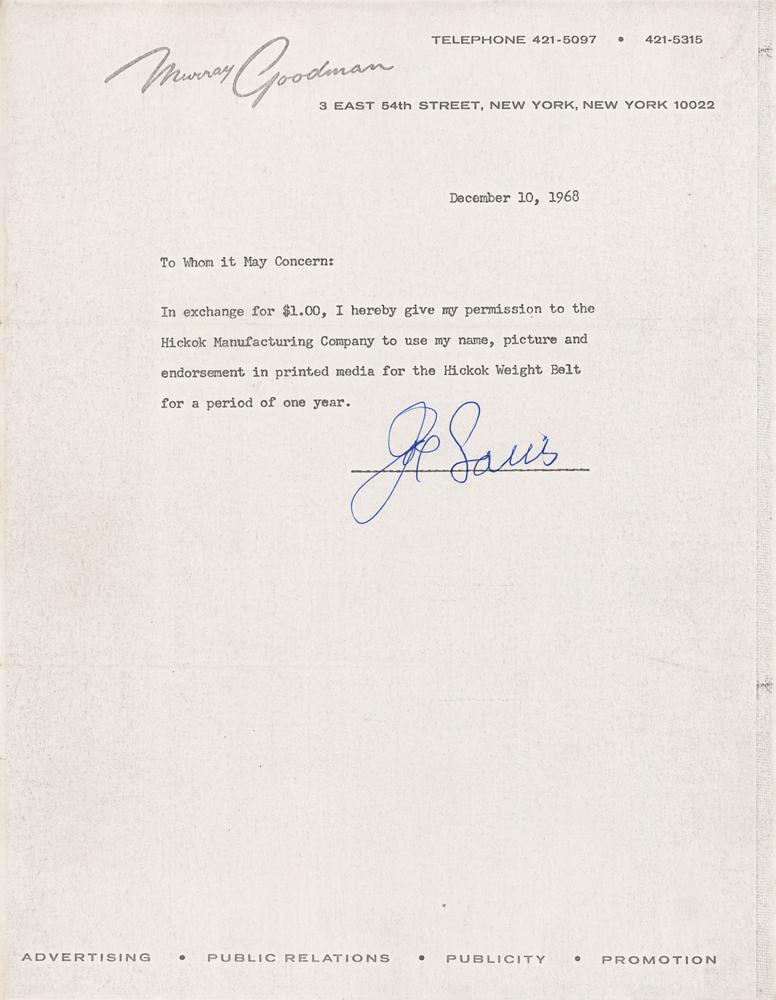 DS, one page, 8.5 x 11, December 10, 1968. Murray Goodman advertising agreement letter, which reads: "In exchange for $1.00, I hereby give permission to the Hickok Manufacturing Company to use my name, picture and endorsement in printed media for the Hickok Weight Belt for a period of one year." Signed at the conclusion in blue ballpoint by Joe Louis. In fine condition.
