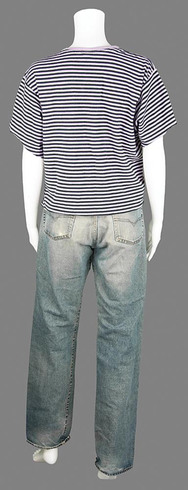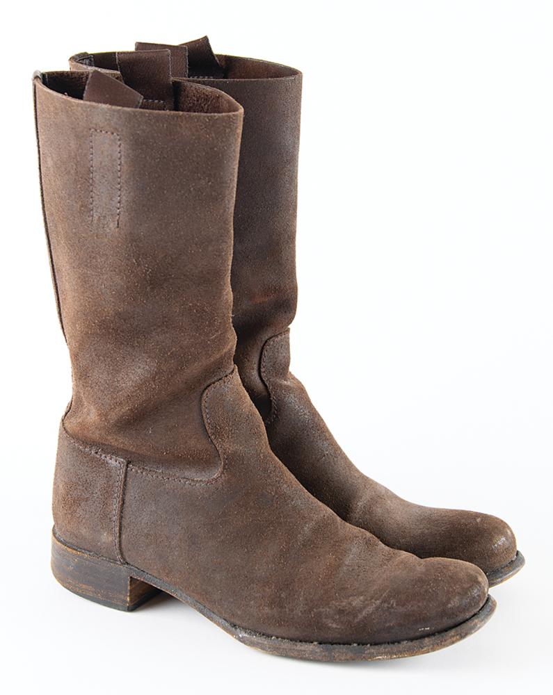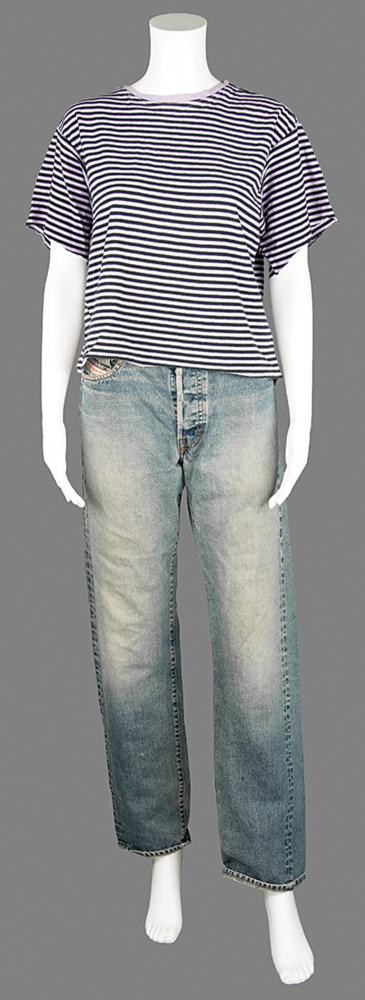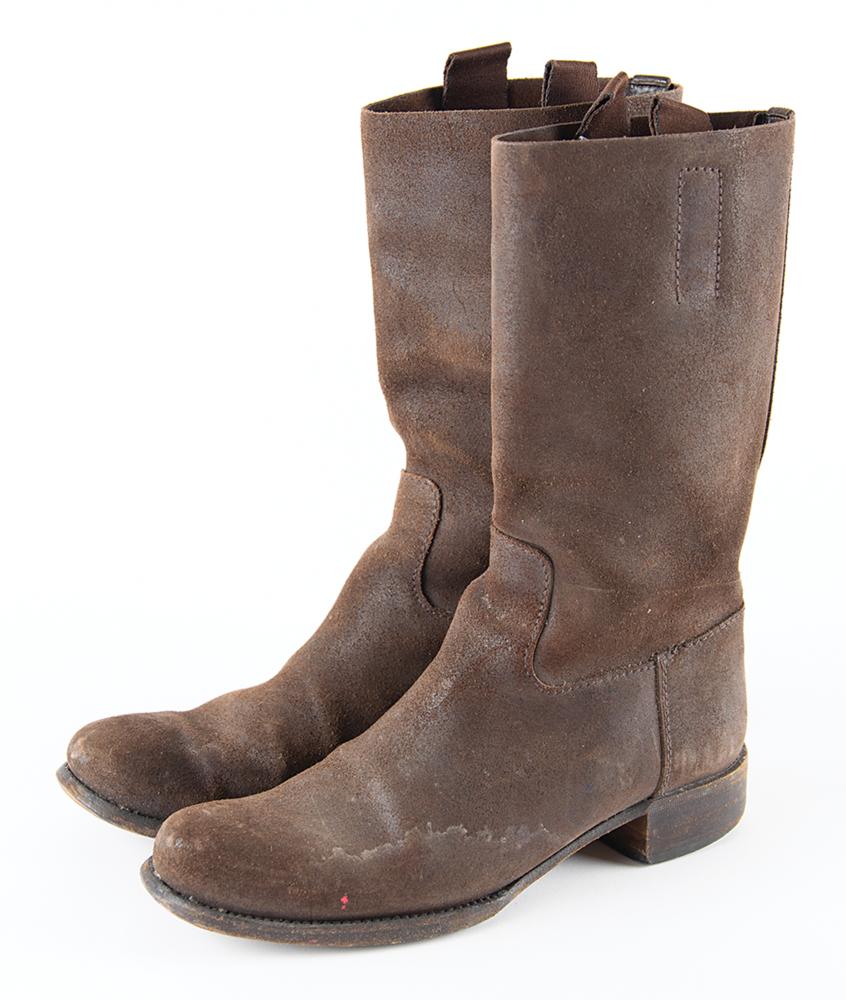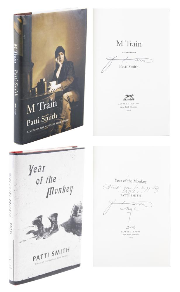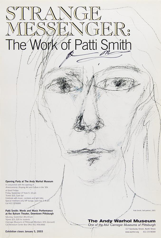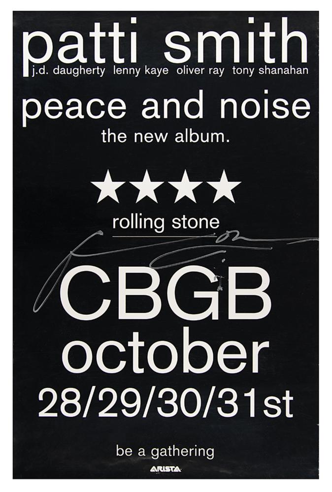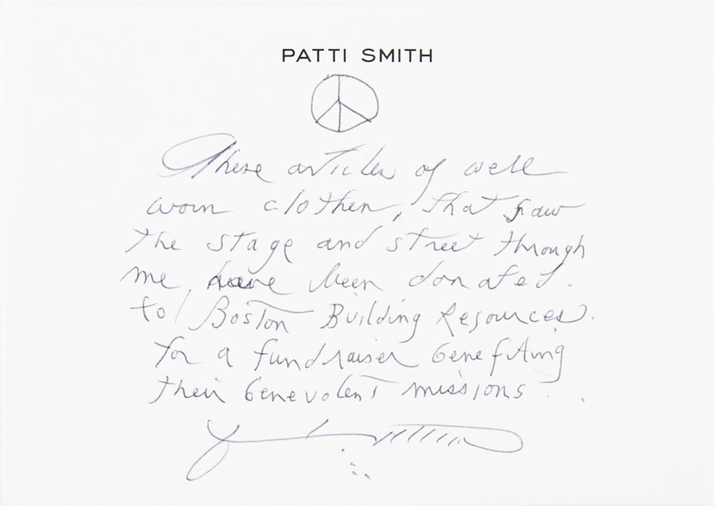 Collection of punk icon Patti Smith's personally-owned and -worn clothing, donated by her to Boston Building Resources for their annual fundraising efforts. The lot is accompanied by a handwritten note on a personal notecard, signed by Smith, in full: "These articles of well worn clothing that saw the stage and street through me have been donated to Boston Building Resources for a fundraiser benefitting their benevolent missions." The personal wardrobe items include: - Patti Smith's well-worn pair of brown suede Prada boots - Patti Smith's well-worn pair of light blue Diesel jeans - Patti Smith's screen-worn black-and-purple striped short-sleeve shirt, as seen in her interview with Charlie Rose on March 23, 2000 Additionally includes five pinback buttons, signed hardcover copies of her books M Train and Year of the Monkey, a glossy 4 x 6 photo of Smith holding a camera, and a fantastic poster collection, with sizes ranging from to 10 x 14 to 25 x 38. Three posters—for appearances/exhibitions at the Art Market Gallery (1995), CBGB (1997), and the Andy Warhol Museum (2003)—have been signed in ink by Patti Smith. The unsigned posters include: three broadsides of Smith's poem 'People Have the Power,' a 1997 Winter Tour poster, and a promo poster for her 1998 book Patti Smith Complete. In overall very good to fine condition, with expected wear to the clothing, and some scattered creasing, small folds, and edgewear to some of the posters. A unique archive of personal materials from the 'poet laureate of punk rock.'