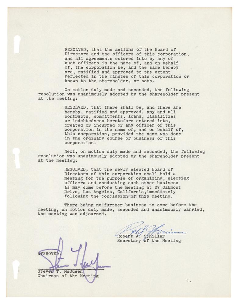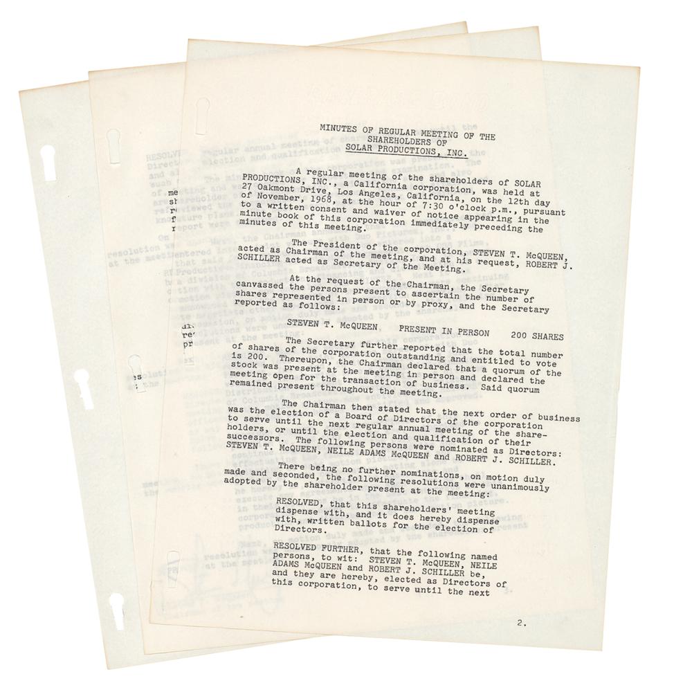 DS, three pages, 8.5 x 11, November 12, 1968. A document regarding "Minutes of Regular Meeting of the Shareholders of Solar Productions, Inc.," which relates to the election of the shareholder directors and a joint venture with Duo Pictures and CBS Films for the motion picture The Reivers. Signed at the conclusion in felt tip, "Steven T. McQueen." In fine condition. Based on a William Faulkner novel, The Reivers starred McQueen alongside Sharon Farrell and Rupert Crosse and was released on December 25, 1969; Crosse’s performance earned him an Academy Award nomination for Best Actor in a Supporting Role, making him the first African American to receive a nomination in this category.
