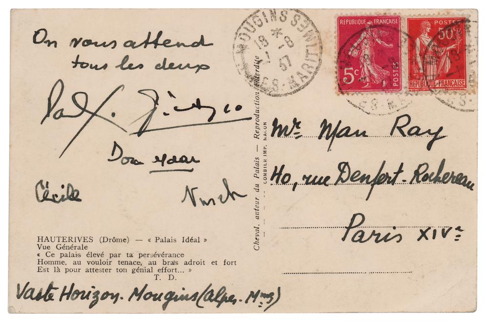 Rare 5.5 x 3.5 postcard of the famed Le Palais Idéal in Hauterives, built by French postman Ferdinand Cheval over the course of thirty-plus years, signed on the reverse in ink by the great Cubist painter Pablo Picasso, Surrealist poet Paul Éluard, model and Surrealist artist Nusch Éluard, their daughter Cécile Eluard, and photographer Dora Maar. Addressed to the important Dada/Surrealist photographer Man Ray at his studio, "40 rue Denfert Rochereau, Paris." Annotated along the bottom edge, "Vaste Horizons, Mougins (Alpes Mmes)," and postmarked at Mougins, Alpes-Maritimes on May 18, 1937. In fine condition. An absolutely outstanding postcard rife with artistic associations, which were recently explored in the Museu Picasso de Barcelona's exhibition 'Pablo Picasso, Paul Eluard: A Sublime Friendship.' Picasso had been introduced to Dora Maar through Paul Éluard in 1936, and they soon became lovers and companions. All of these figures were politically and artistically aligned, and were often the subjects of one another's works. According to the museum: 'Nusch became a topic of aesthetic research and the protagonist of many portraits by Picasso, above all between 1936 and 1941. In those years, the friendship and reciprocal admiration and emulation between Picasso and Eluard led them to share their holidays together for three summers in a row in the hotel Vaste Horizon de Mougins, along with other friends. There, Picasso produced various portraits of Nusch, of Maar and of Eluard’s daughter, Cécile, as well as a cryptic portrait of Paul Eluard dressed up as Arlésienne, known as Arlesiana amamantando un gato.' In addition to her role as the subject of several paintings by Picasso, Dora Maar also photographed the successive stages of the creation of Picasso's powerful anti-war painting, 'Guernica.' A remarkable combination of autographs sent to Man Ray.