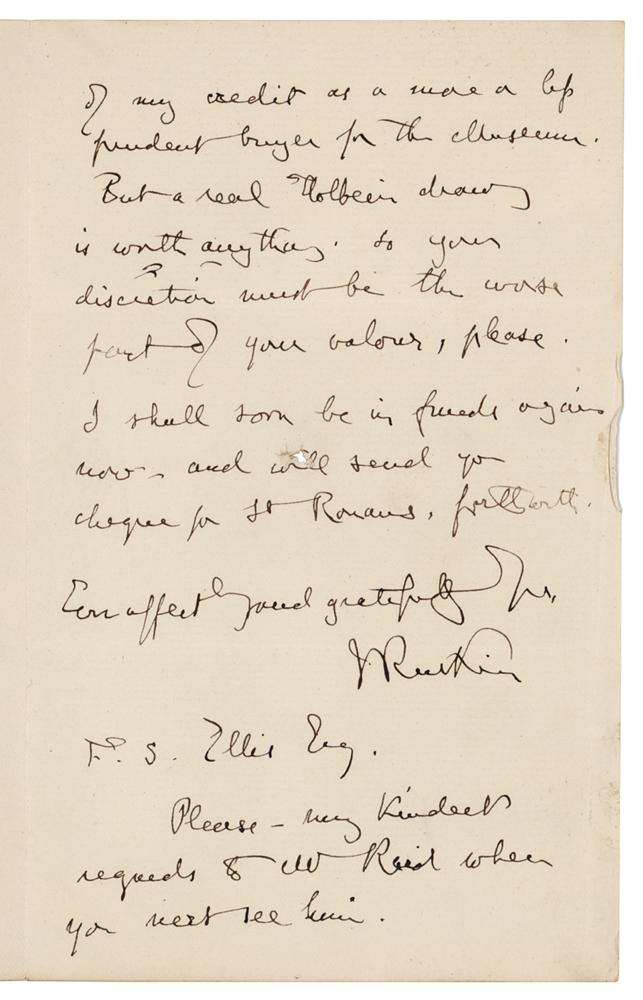 Influential English art critic and writer (1819-1900) remembered as a champion of the work of J.M.W. Turner. ALS signed “J. Ruskin,” two pages on two adjoining sheets, 4.25 x 7, Brantwood letterhead, April 20, 1881. Handwritten letter regarding an auction of Hans Holbein paintings, in part: "A myriad thanks for the copy of letter on the most curious piece of autobiography I ever saw or heard of…If Mr. Reid is going to bid for those Holbeins, I will not bid against him—but if not, I will give you carte blanche for them, to be used at your paternal discretion—in respect of my credit as a more or less prudent buyer for the Museum. But a real Holbein drawing is worth anything. So your discretion must be the worse part of your valour, please." In fine condition, with a rusty circular paperclip impression to the top and a small puncture at center.
