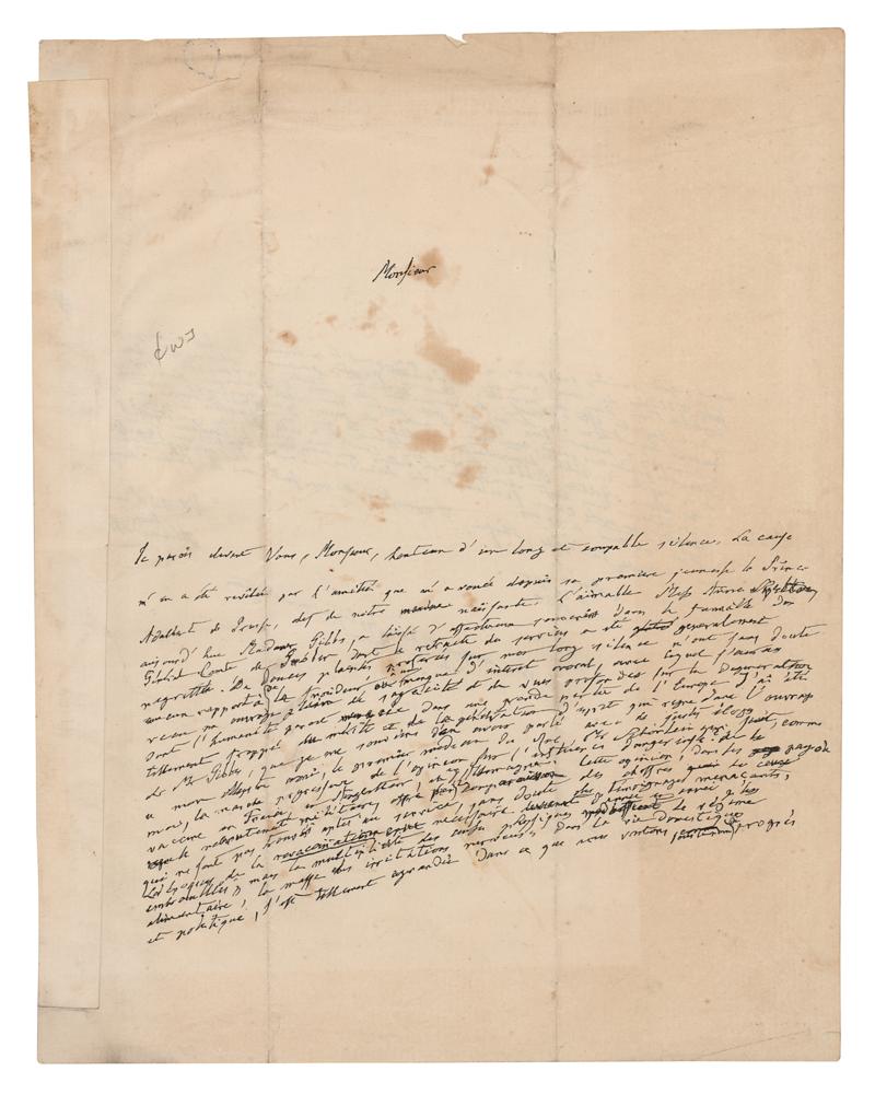 German naturalist and explorer (1769-1859) who wrote Kosmos, a massive five-volume study which attempted to unify the various branches of man's knowledge. ALS in French, signed “Alexander Humboldt,” one page both sides, 7.75 x 10, October 18, 1858. Lengthy untranslated handwritten letter by the celebrated naturalist. In very good condition, with intersecting folds, several light stains, scattered creases, a mounting strip affixed to one edge, a rusty circular paperclip impression to the top, and a few minor edge nicks and tears.