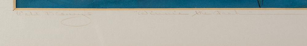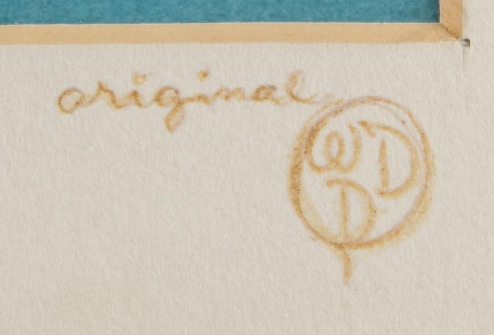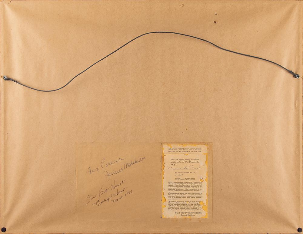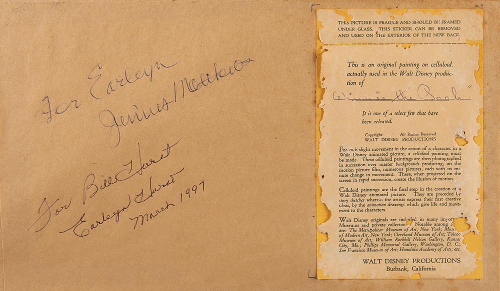 (Walt Disney Studios, 1966) Original production cels and key master background featuring Winnie the Pooh, Rabbit, and Gopher from the animated featurette Winnie the Pooh and the Honey Tree, the last short film produced by Walt Disney. The cels are trimmed and applied to a hand-painted key master production background from film. The scene shows Winnie-the-Pooh gloomily stuck in "Rabbits House," Rabbit pounding a "Dont Feed the Bear" sign into the ground, and Gopher pleasantly observing all the action. Displayed in its original Walt Disney mount, annotated, "Walt Disney's 'Winnie the Pooh,'" with an "Original WDP" stamp to lower right. Character images range from 1.5 x 2.5 (Gopher) to 6 x 5.75 (Rabbit with sign) with a mat opening of 17.25 x 11. Framed to an overall size of 24.5 x 18.75, with the original Walt Disney Productions label on the reverse. Also signed and inscribed on the reverse in ballpoint by Junius Matthews, "For Earleyn, Junius Matthews," with a later presentation inscription by Earleyn below. Matthews was the original voice of Rabbit in the Winnie the Pooh franchise from 1966 to 1977. In fine condition.