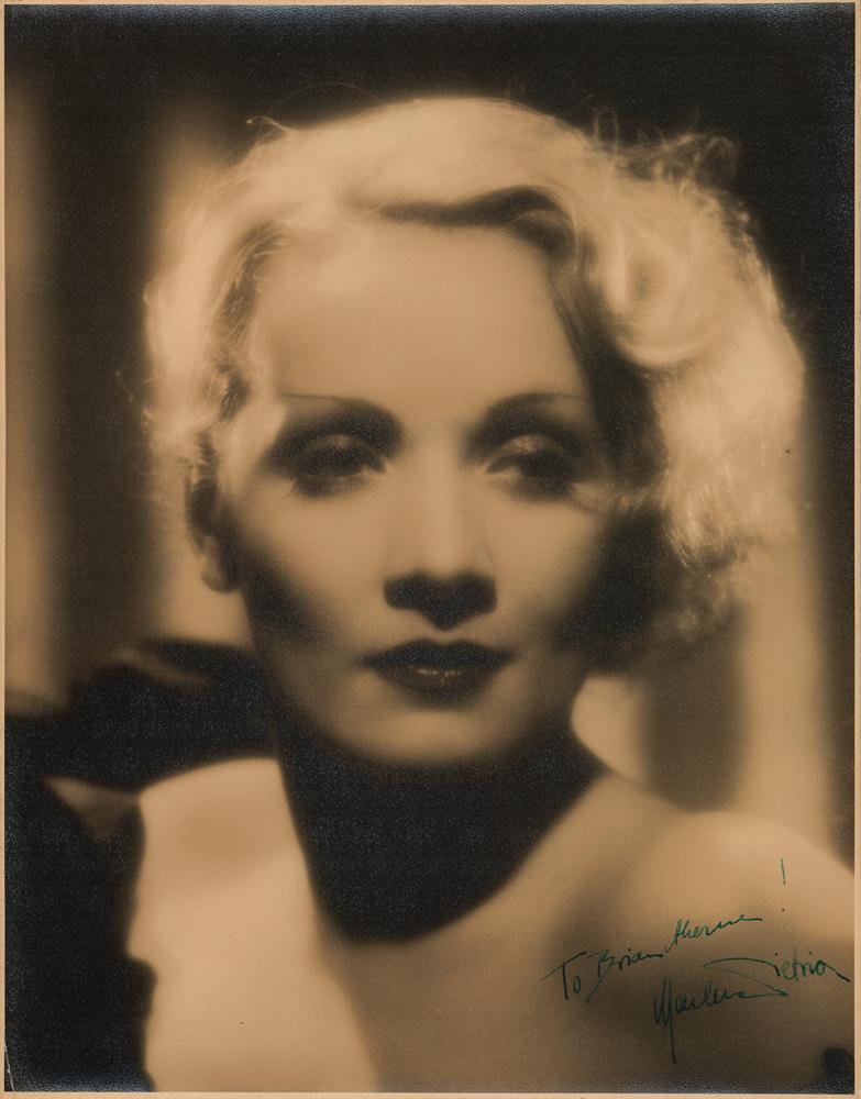 Stunning vintage sepia matte-finish 10.5 x 13.5 soft-focus portrait photo of Dietrich in a lovely up-close pose, signed and inscribed in green fountain pen to her costar in the 1933 film The Song of Songs, "To Brian Aherne! Marlene Dietrich.” In fine condition, with curling to the edges. Dietrich and Aherne were, for a short time, romantically linked not long after the July 1933 release of The Song of Songs, a film that marked Aherne's American film debut. The affair appeared to reach its conclusion in August of 1934, when Aherne learned of Dietrich's new relationship with Hans Jaray. Heartbroken, Aherne wrote to his former lover: 'This will be short. You have hurt me more than I have ever been hurt by any person in my life. After all we have been to each other and all you have said to me it is unbelievable that you should have dealt me such cruel and terrible blows. If you wanted to get rid of me you had only to say one word to me. I am no Chevalier or de Acosta and I have too much pride to reproach you or plead with you, but if it is any satisfaction to you to know it I have suffered damnably in the last few weeks and I can find no relief in anything or anybody. I have hurt people in my life, though never I think willingly, and it is awful to think it may have been as bad for them as this.'