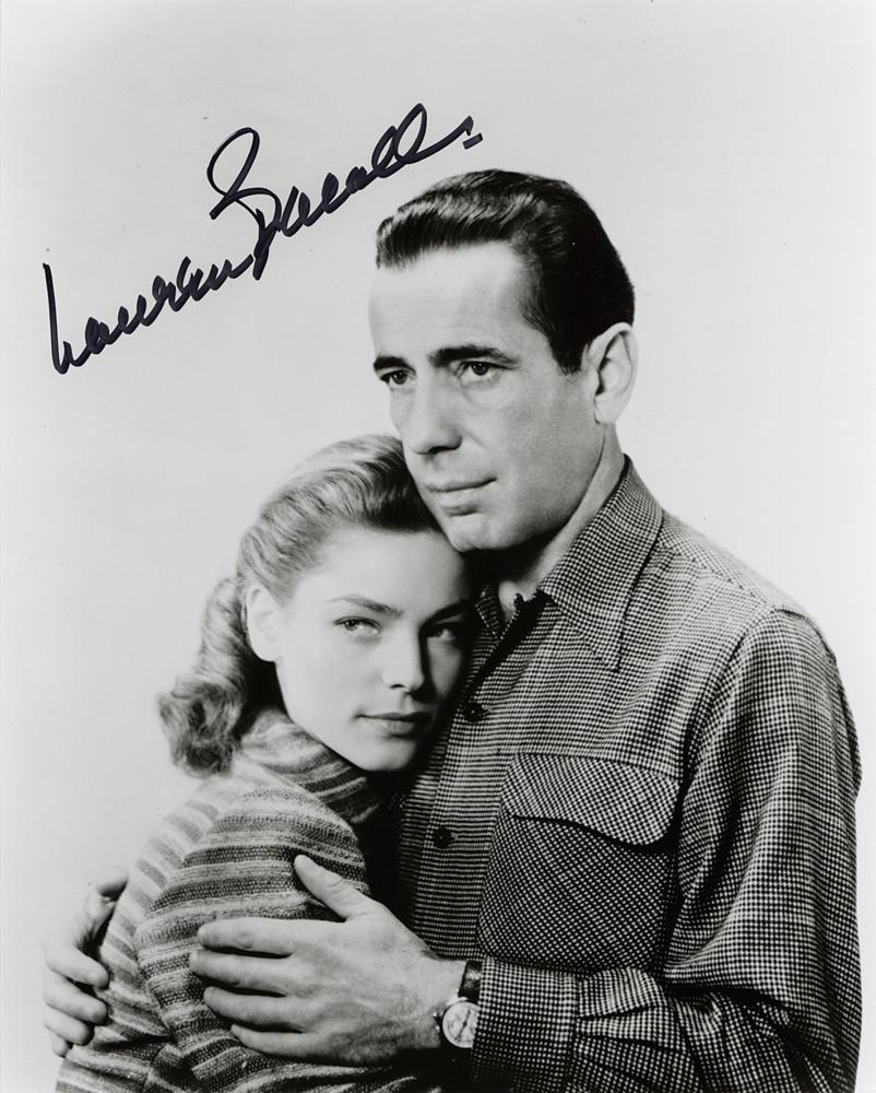 Glossy 8 x 10 photo of legendary Hollywood power couple Humphrey Bogart and Lauren Bacall, the latter of whom has signed in black felt tip. In very fine condition.