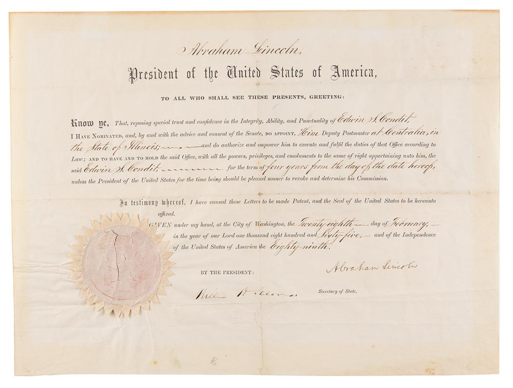 Partly-printed DS as president, one page, 14.75 x 11, February 28, 1865. President Lincoln appoints Edwin S. Condit at "Deputy Postmaster at Centralia, in the State of Illinois." Neatly signed at the conclusion in ink by President Abraham Lincoln and countersigned by Secretary of State William H. Seward. The white paper seal affixed to the lower left is complete, but cracked at the center. Professionally repaired and restored to near-fine condition.