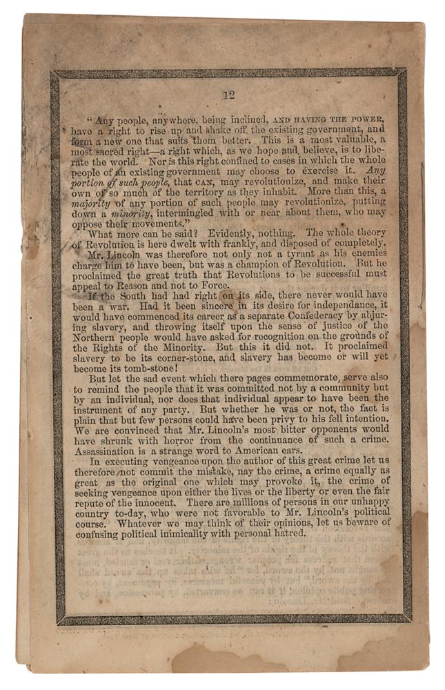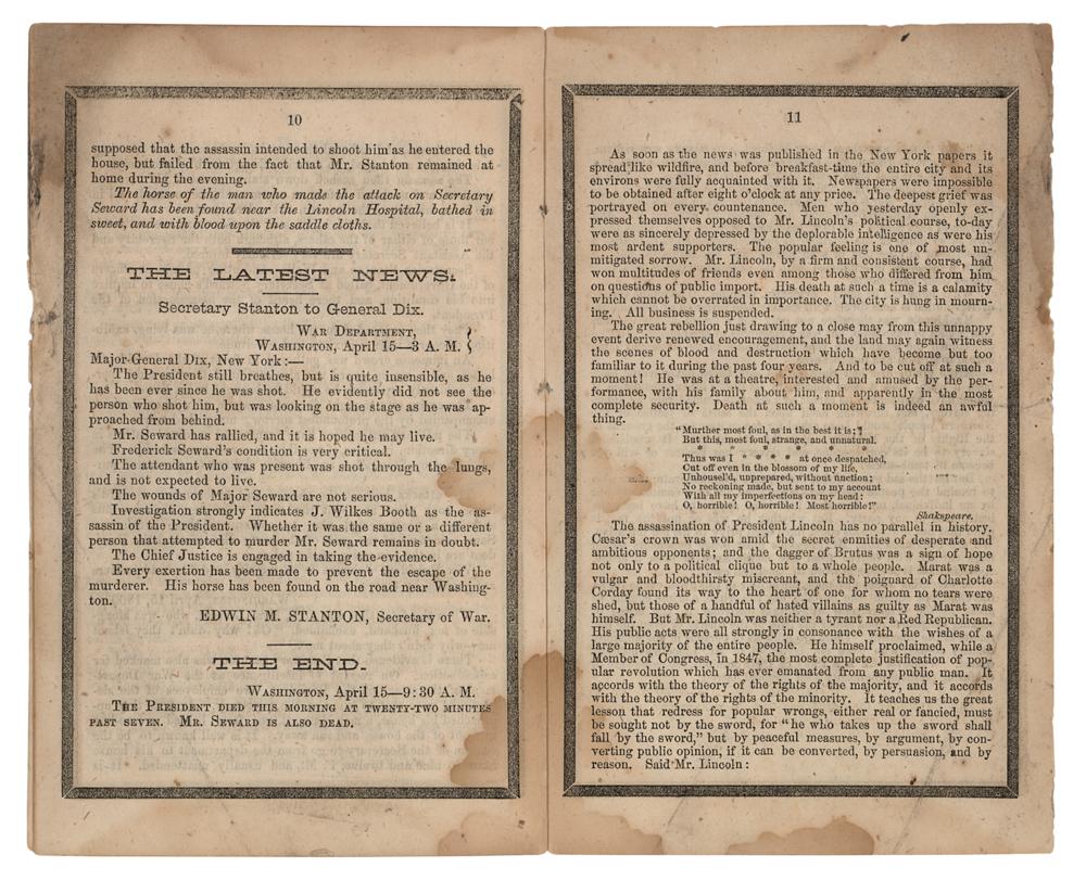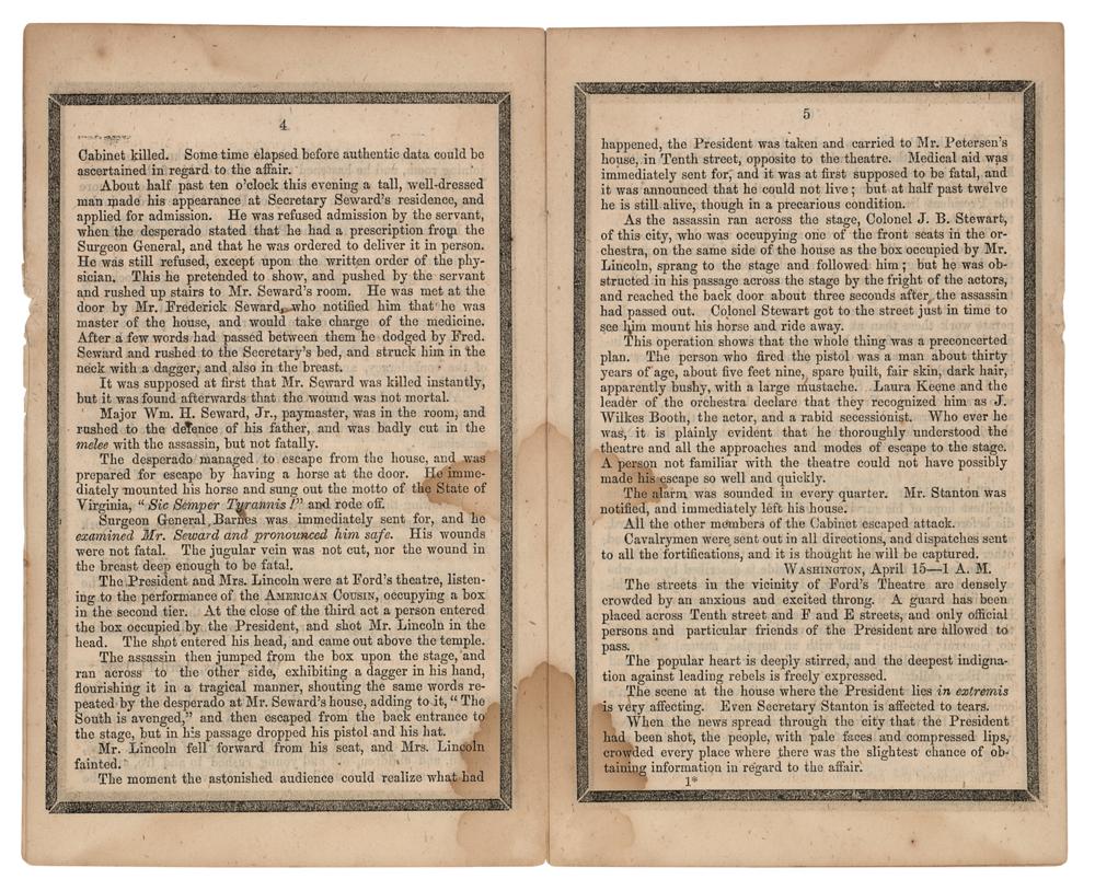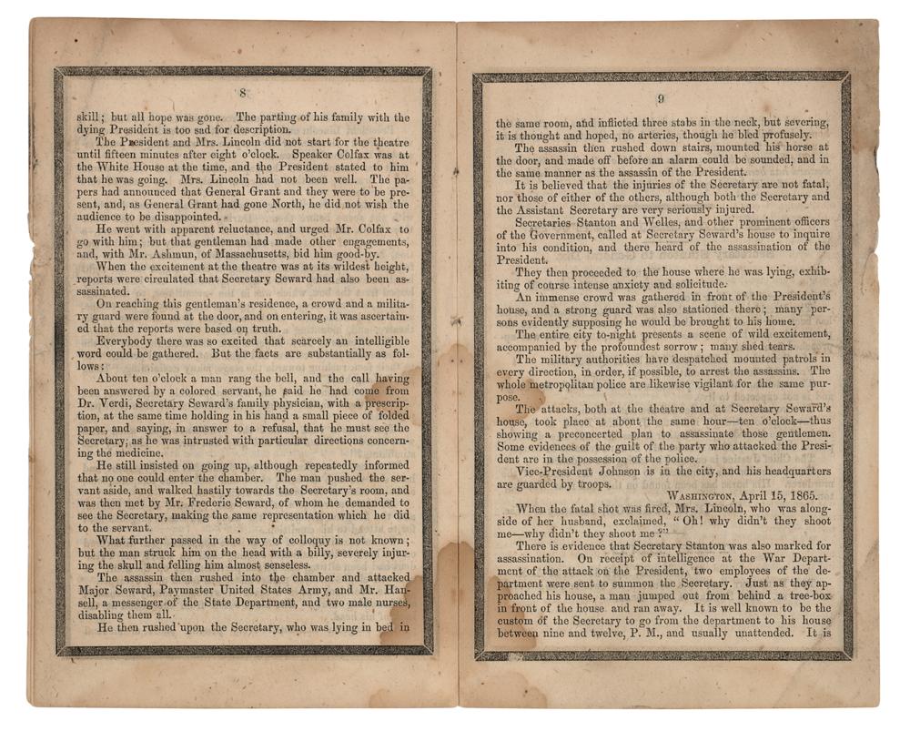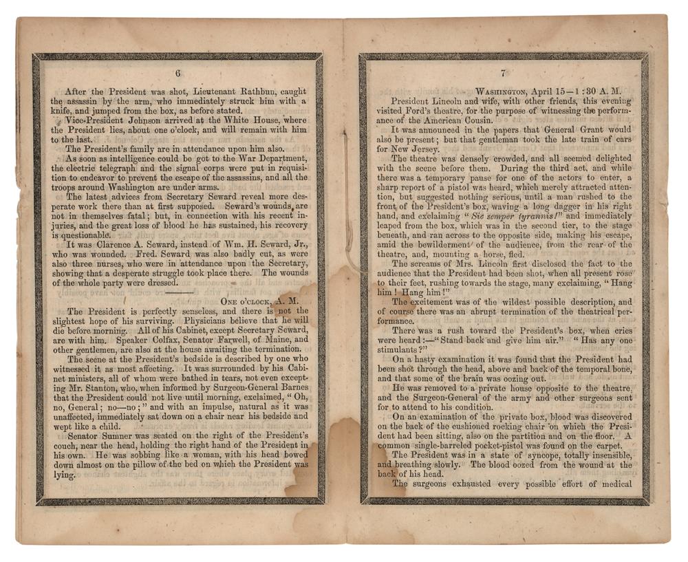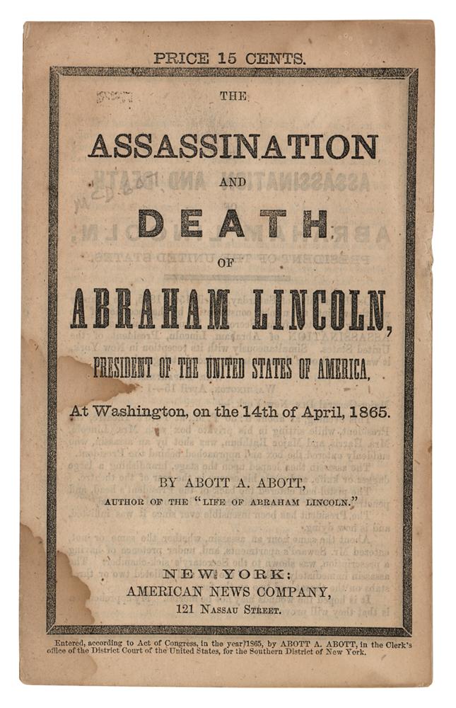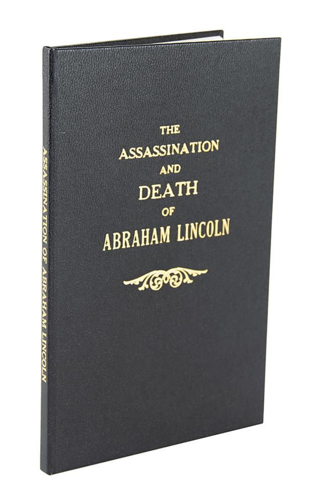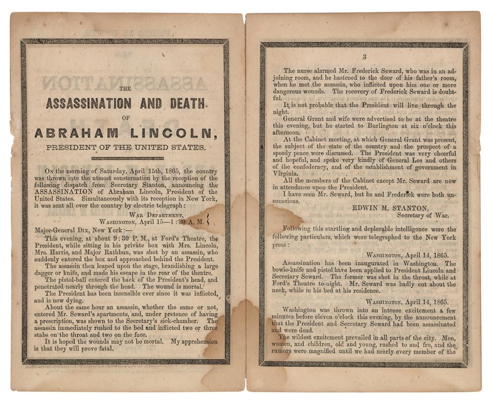 Scarce booklet entitled "The Assassination and Death of Abraham Lincoln, President of the United States of America, At Washington, on the 14th of April, 1865," by Abott A. Abott, published in New York in 1865 by the American News Company, 12 pages, 4.5 x 7.5, containing transcripts of Secretary of War Edwin M. Stanton's announcement of President Lincoln's assassination, further telegraphic coverage of the shooting at Ford's Theatre, Lincoln's death at the Petersen House, erroneous reports of Secretary of State Seward's death, and other goings-on in Washington. Each leaf is edged in black to represent mourning. In very good to fine condition, with light staining and creasing. Accompanied by a custom-made cloth folding box, gilt-stamped on the front: "The Assassination and Death of Abraham Lincoln."
