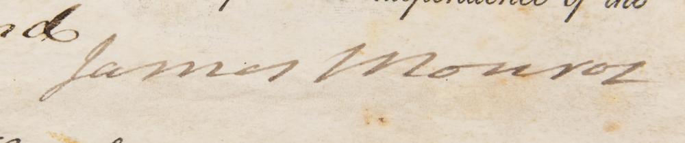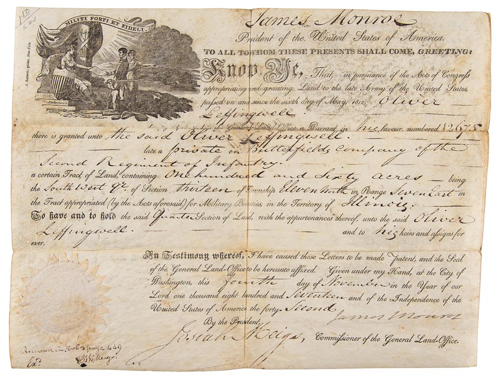 Partly-printed vellum DS as president, one page, 11.25 x 8.5, November 4, 1817. Desirable military land grant by which President Monroe, "in pursuance of the Acts of Congress appropriating and granting Land to the Army of the United States," grants Oliver Leffingwell, "late a private in Butterfield's Company of the Second Regiment of Infantry," a 160-acre tract of land in the Territory of Illinois. Nicely signed at the conclusion by President James Monroe and countersigned by Commissioner of the General Land Office Josiah Meigs. The white paper seal affixed to the lower left remains intact. In very good to fine condition, with trimmed edges and scattered soiling.