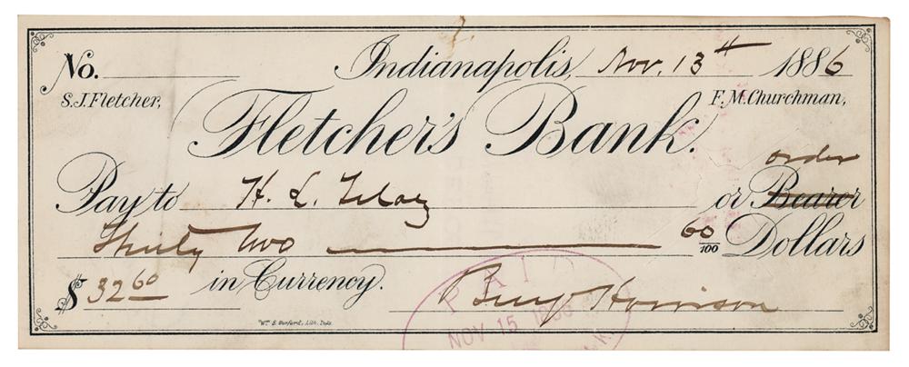 Fletcher's Bank check, 7.25 x 2.75, filled out and signed by Harrison, "Benj. Harrison," payable to H. L. Tetaz for $32, November 13, 1886. In fine condition.