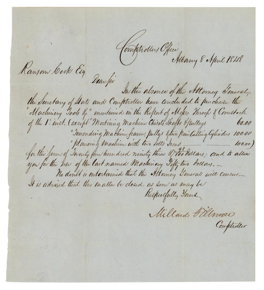 LS, one page, 7.75 x 8.75, April 8, 1848. Letter to Ransom Cook, in part: "In the absence of the Attorney General, the Secretary of State and Comptroller have concluded to purchase the 'Machinery Tools &c' mentioned in the Report of Messrs. Throop & Comstock?for the sum of Twenty four hundred ninety three & 98/100 dollars." In fine condition. Fillmore was the first comptroller of New York to be elected, the post having previously been appointed by the state legislature. In that office, he was a member of the state canal board, supported its expansion, and saw that it was managed competently.