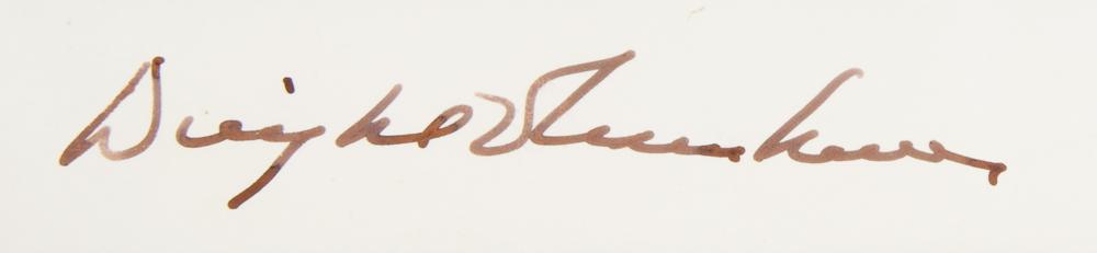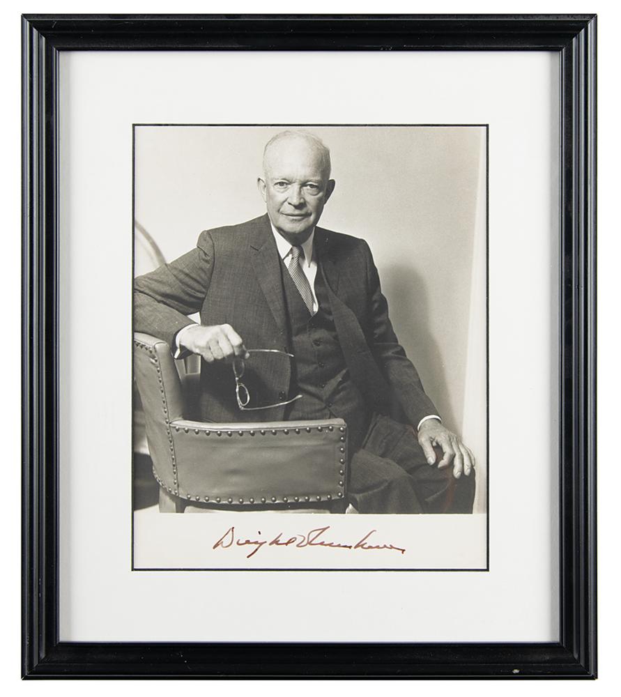 Superb matte-finish 7.5 x 9.5 photo of Dwight D. Eisenhower in a handsome half-length seated pose, signed beautifully in the lower border in fountain pen. Matted and framed to an overall size of 12 x 14. In fine condition.