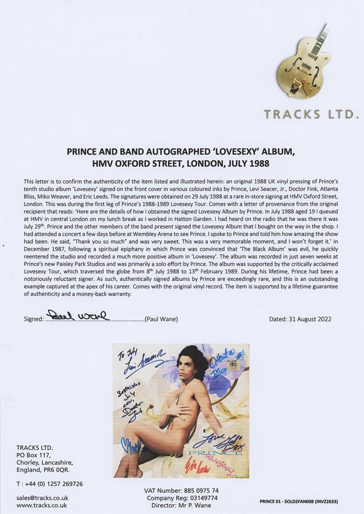Accompanied by a certificate of authenticity from Tracks, a modern color 6 x 4 photo of Prince arriving at the HMV signing, and a letter of provenance from the original recipient, which reads: “Here are the details of how I obtained the signed Lovesexy Album by Prince. In July 1988 aged 19 I queued at HMV in central London on my lunch break as I worked in Hatton Garden. I had heard on the radio that he was there it was July 29th. Prince and the other members of the band present signed the Lovesexy Album that I bought on the way in the shop. I had attended a concert a few days before at Wembley Arena to see Prince. I spoke to Prince and told him how amazing the show had been. He said ‘Thank you so much’ and was very sweet. This was a very memorable moment and I won’t forget it.”