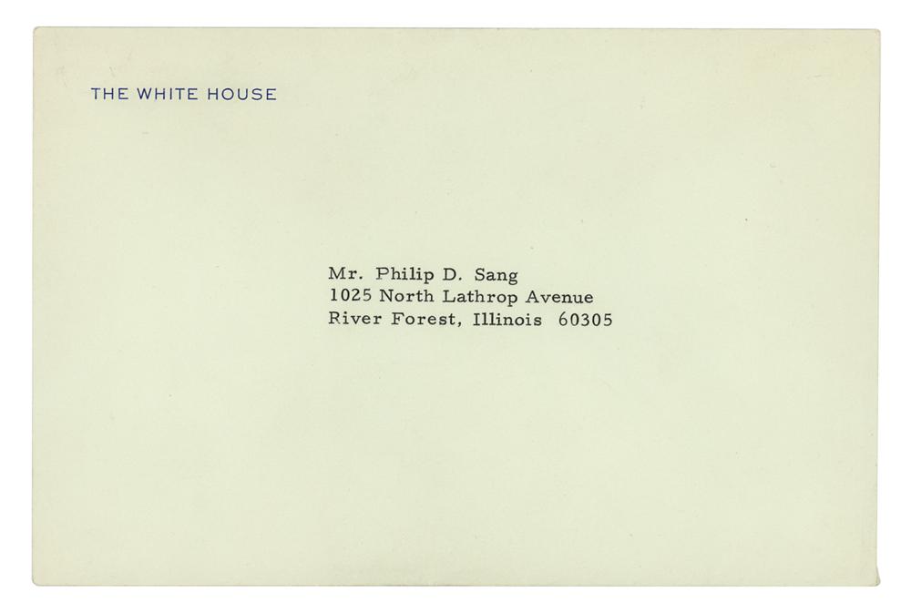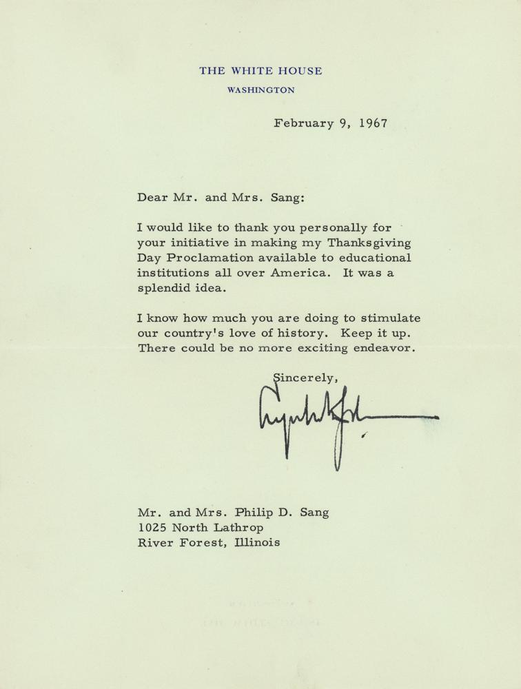 TLS as president, one page, 6.75 x 9, White House letterhead, February 9, 1967. Letter top Mr. and Mrs. Philip D. Sang, in full: "I would like to thank you personally for your initiative in making my Thanksgiving Day Proclamation available to educational institutions all over America. It was a splendid idea. I know how much you are doing to stimulate our country's love of history. Keep it up. There could be no more exciting endeavor." In very fine condition, with a trivial brush to the end of the signature. Accompanied by the original envelope. Philip D. Sang assembled one of the finest private autograph and manuscript collections of the 20th century, and worked to promote the understanding of history through archival materials. Sang donated manuscript collections to Brandeis University, Yale University, the Illinois State Historical Museum, and Southern Illinois University, among others. He also loaned items from his vast collection to many museums and libraries for historical exhibits. Sang was a successful corporate executive who served as president of the Goldenrod Ice Cream Company, as a corporate officer for Humiston-Keeling (a pharmaceutical company), and as a director for the vending machine firm ARA (Automatic Retailers of America). A desirable presidential letter to a noteworthy collector.
