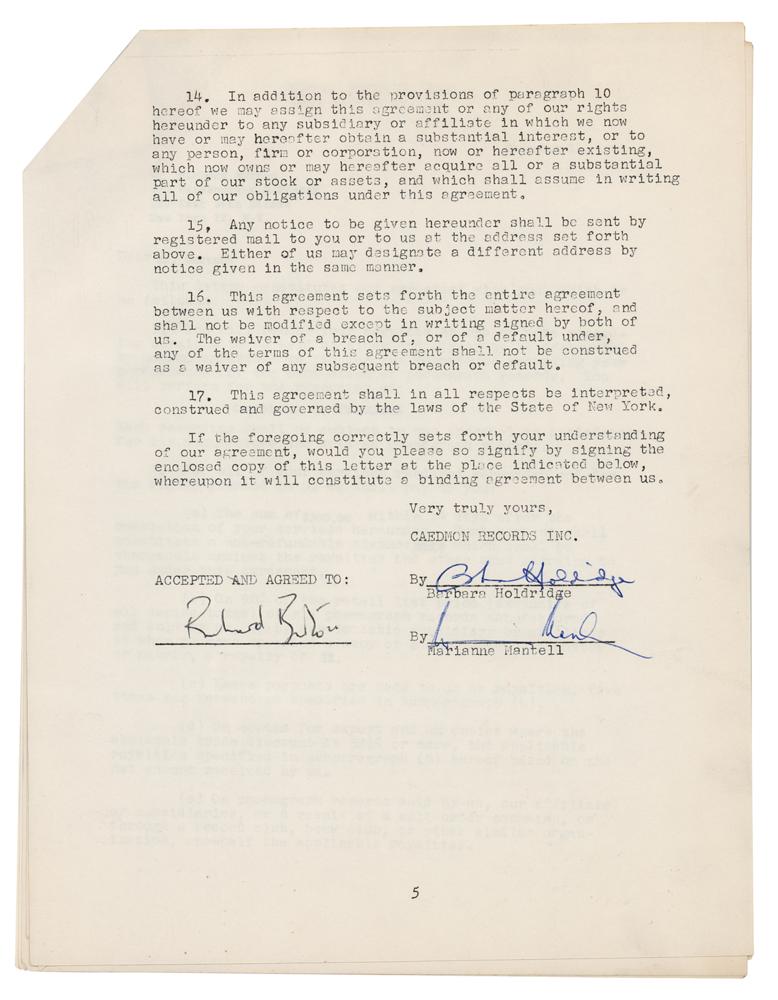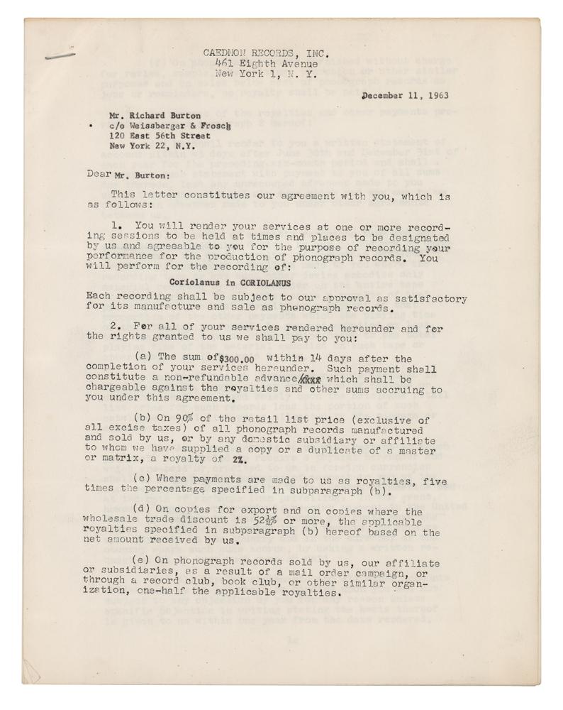 DS, six pages, 8.5 x 11, December 11, 1963. Document by which Burton agrees to "perform for the recording of Coriolanus in Coriolanus," for the sum of $300 plus royalties. Signed at the conclusion in ballpoint by Burton and countersigned by two Caedmon Records executives. In fine condition.