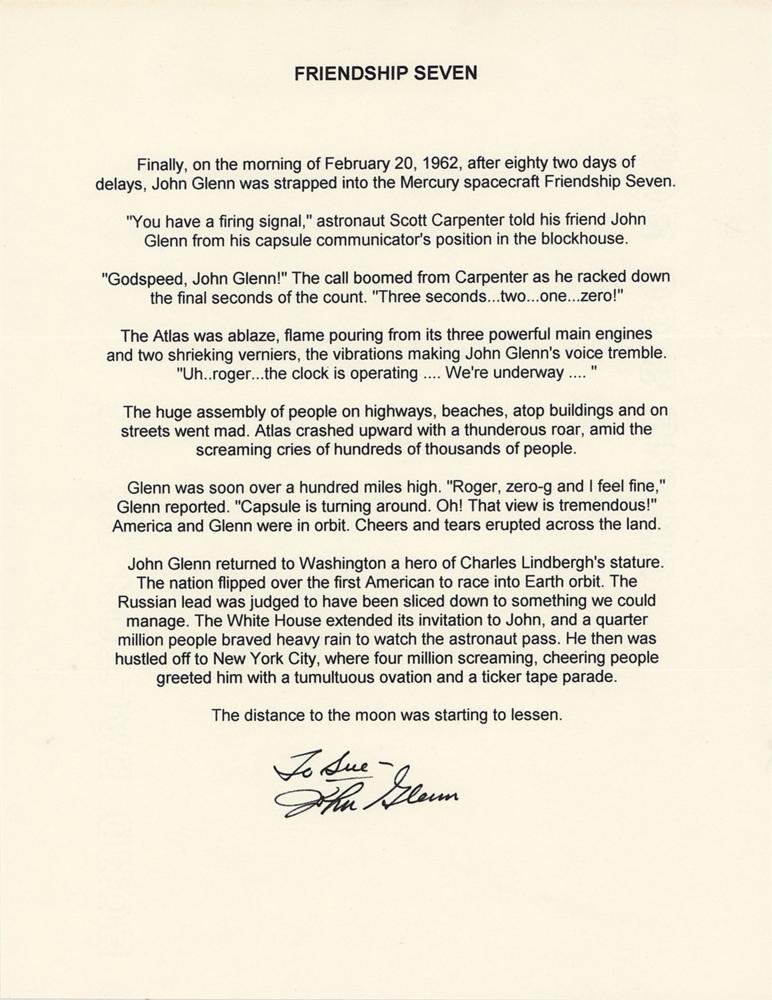Souvenir typescript, one page, 8.5 x 11, signed and inscribed at the conclusion in black felt tip, "To Sue—John Glenn." An excerpt describing John Glenn's Friendship 7 flight, in part: "John Glenn returned to Washington a hero of Charles Lindbergh's stature. The nation flipped over the first American to race into Earth orbit. The Russian lead was judged to have been sliced down to something we could manage." In fine condition, with two horizontal mailing folds.