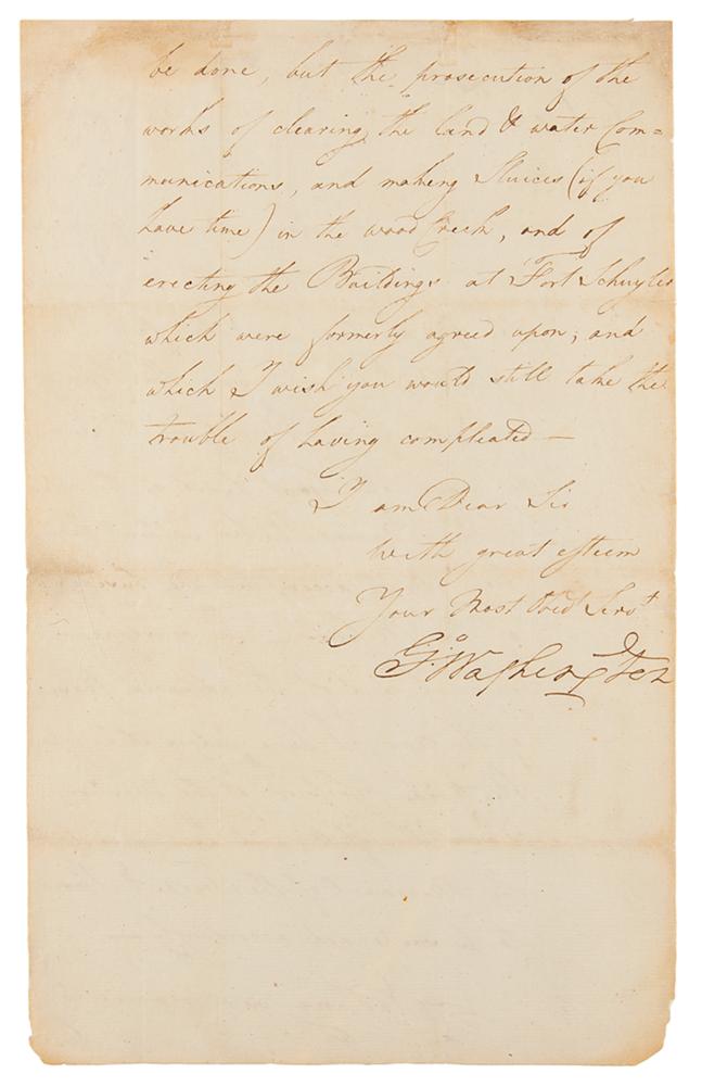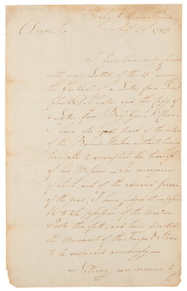 Revolutionary War-dated LS signed “Go: Washington,” one page both sides, 8 x 12.75, August 29, 1783. Letter to Lt. Col. Marinus Willett, sent from Rocky Hill (near Princeton), just four days prior to the signing of the Treaty of Paris, which marked the formal end of the American Revolution. "I have been duly favored with your Letter of the 15th covering the Extract of a Letter from Lieut. Charles De Peyster and the Copy of a Letter from Brig' Gen'l McClean. I have also just heard of the return of the Baron Steuben without having been able to accomplish the business of his Mission—In consequence of which, and of the advanced season of the year, I have judged it impossible to take possession of the Western Posts this fall; and have directed the Movement of the Troops, & Stores to be suspended accordingly—Nothing now remains to be done, but the prosecution of the works of clearing the land & water communications, and making Sluices (if you have time) in the wood Creek, and of erecting the Buildings at Fort Schuyler, which were formerly agreed upon; and which I wish you would still take the trouble of having compleated." In fine condition, with light edge wear, and a professional repair to minor loss to the upper right corner. The text of this letter is published in The Writings of George Washington, Vol. 27, which states that the recipient was Lieutenant Colonel Marinus Willett. Washington observes that, in spite of the war drawing to a close, it will be "impossible to take possession of the Western Posts this fall," and he has therefore directed his troops elsewhere. As part of the Treaty of Paris, concluded on September 3, 1783, the British agreed to withdraw all 'armies, garrisons, and fleets from the said United States, and from every post, place, and harbor within the same.' In spite of the treaty, the British refused to vacate several forts in the Northwest Territory and in New York, including Fort Mackinac, Fort Lernoult, Fort Niagara, Fort Oswegatchie, and Fort Ontario. Eleven years later, the British finally agreed to relinquish their holdings as part of the Jay Treaty, concluded in 1796 during George Washington's presidency.