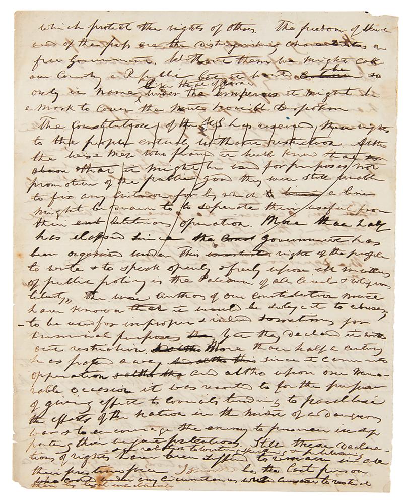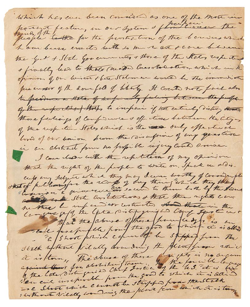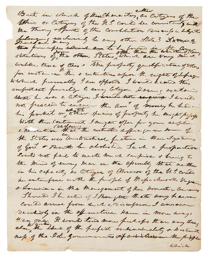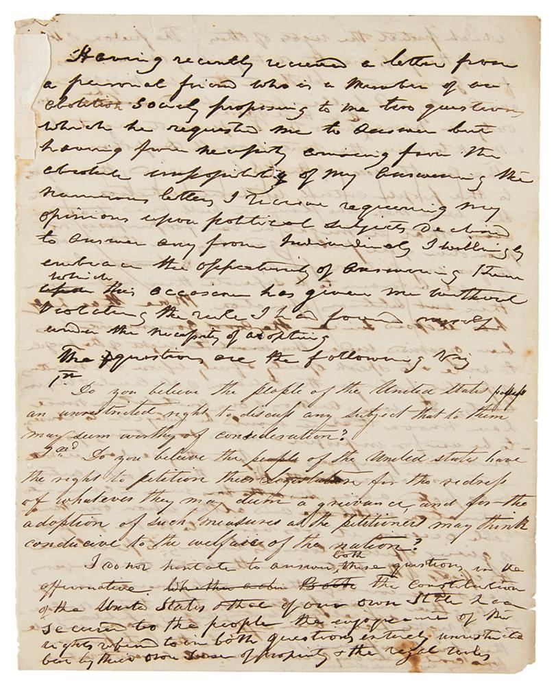 Important unsigned handwritten manuscript by William Henry Harrison, totaling four pages on three sheets, 8 x 10, no date but circa 1840. During his campaign for the presidency, Harrison drafts a careful response to questions posed to him by an abolitionist society, citing the United States Constitution while asserting states' rights. Harrison begins the manuscript, in part: "Having recently received a letter from a personal friend who is a member of an abolition society proposing to me two questions?I willingly embrace the opportunity of answering them." The two questions follow, penned neatly in another hand: "Do you believe the people of the United States possess an unrestricted right to discuss any subject that to them may seem worthy of consideration??Do you believe the people of the United States have the right to petition their Legislature for the redress of whatever they may deem a grievance, and for the adoption of such measures as the petitioners may think conducive to the welfare of the nation?" Harrison replies below, writing, in part: "I do not hesitate to answer both questions in the affirmative. The Constitution of the United States & that of our own state have secured to the people the enjoyment of the rights referred to in both questions, entirely unrestricted but by their own sense of propriety & the legal rules which protect the rights of others. The freedom of speech and of the press are the distinguishing characters of free government. Without them we might call our country a Republic but it would be so only in name, like that of Rome under the Emperors, it might be a mask to cover the most horrible despotism. [struck through: The Constitution of the U.S. has reserved these rights to the people entirely without restriction?]." Harrison continues: "The authors of our Constitution must have known that it would be subject to abuses, to be used for improper & indeed sometimes for criminal purposes, yet they declared it without restriction. More than half a century has passed away since it came into operation, and altho' upon one memorable occasion it was resorted to for the purpose of giving effect to councils tending to paralyze the efforts of the nation in the midst of a dangerous war, and to encourage the enemy to persevere in supporting their unjust pretensions, still these declarations of rights in relation to writing, speaking & publishing, have been suffered to remain in all their pristine force. I should be the last person who could under any circumstances consent to restrict them by legal enactments. But in which of these characters either as citizens of the Ohio or citizens of the US, could we consistently with the theory and spirit of the Constitution discuss a subject belonging exclusively to any other State? There are many principles to be found in the Constitutions of some of the States, other than the toleration of slavery, which are very much unlike those of Ohio. The property qualification of voters for instance. This is a restriction upon the right of suffrage to which personally I am opposed, I would accord this important privilege to every citizen, I would not proceed to enquire the am't of money he had in his pocket, or what other specie of property he might possess. With these sentiments I might offer for your adoption a resolution declaring that the restricted suffrage in some of the States was an aristocratical feature in their systems of Gov't & should be abolished. Such a proposition could not fail to create much surprise & bring to the mind of every man in the assembly that neither in his capacity as a citizen of Ohio nor of the US, could he interfere with the people of Massachusetts, Virginia & Louisiana in the management of their domestic concerns. Should I be asked if I thought any harm could arrive from such a discussion I answer decidedly in the affirmative. Harm in more ways than one. It would tend more perhaps than anything else to destroy the idea of the perfect individuality & distinctness of the State governments which has been considered as one of the most important features in our system?which in the opinion of our wisest & best statesmen would be the immediate precursor of the downfall of liberty. It could not fail also to produce a state of unfriendly feeling between the people of the respective states which is the only effective bond of our union." Harrison reiterates his unequivocal belief in the right to free speech, yet again qualifying his answer: "The abuse of these rights is no argument for abolishing them. In the forcible language of the late distinguished Chief Justice of the US, 'it is an evil inseparable from the good to which it is allied—a shoot which cannot be stripped from the stalk without vitally wounding the plant from which it is torn.'" In overall fine condition. Harrison addresses several topics of great importance, notably alluding to the House of Representatives' 'gag rule' of 1836, which tabled all discussions relating to the slavery issue. In defending free speech as a core value of the United States and its Constitution, Harrison speaks in opposition to the gag rule itself, but cedes control of slavery matter to the states. A Southern slaveholder by birth, Harrison would echo these ideals in his inaugural address: 'The attempt of those of one state to control the domestic institutions of another can only result in feelings of distrust and jealousy, the certain harbingers of disunion, violence, and civil war, and the ultimate destruction of our free institutions.' With these observations, Harrison thus predicted the Civil War.