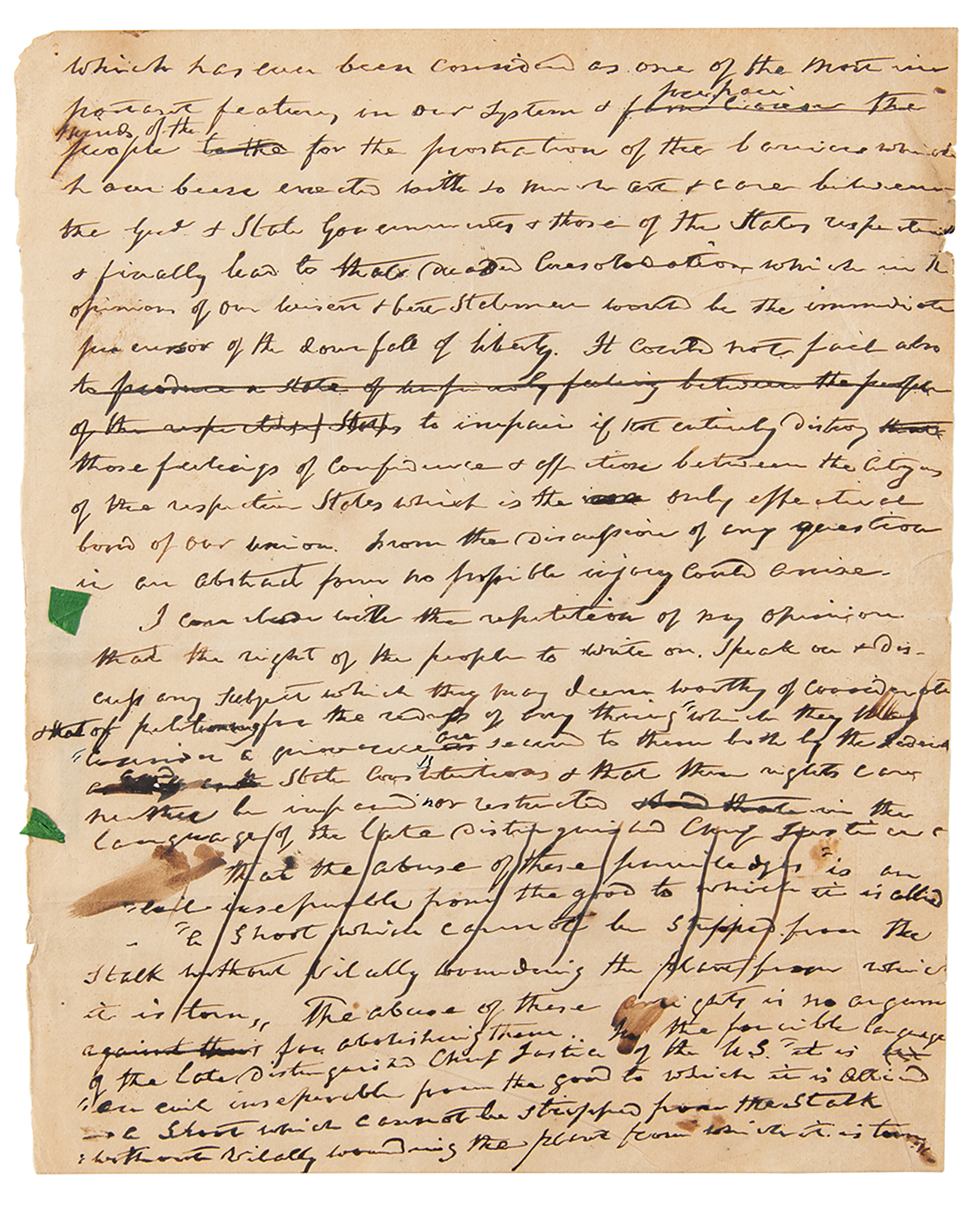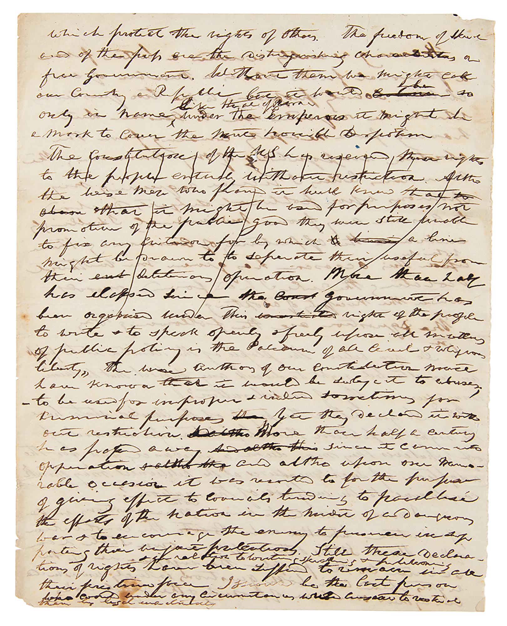 Harrison continues: "The authors of our Constitution must have known that it would be subject to abuses, to be used for improper & indeed sometimes for criminal purposes, yet they declared it without restriction. More than half a century has passed away since it came into operation, and altho' upon one memorable occasion it was resorted to for the purpose of giving effect to councils tending to paralyze the efforts of the nation in the midst of a dangerous war, and to encourage the enemy to persevere in supporting their unjust pretensions, still these declarations of rights in relation to writing, speaking & publishing, have been suffered to remain in all their pristine force. I should be the last person who could under any circumstances consent to restrict them by legal enactments.