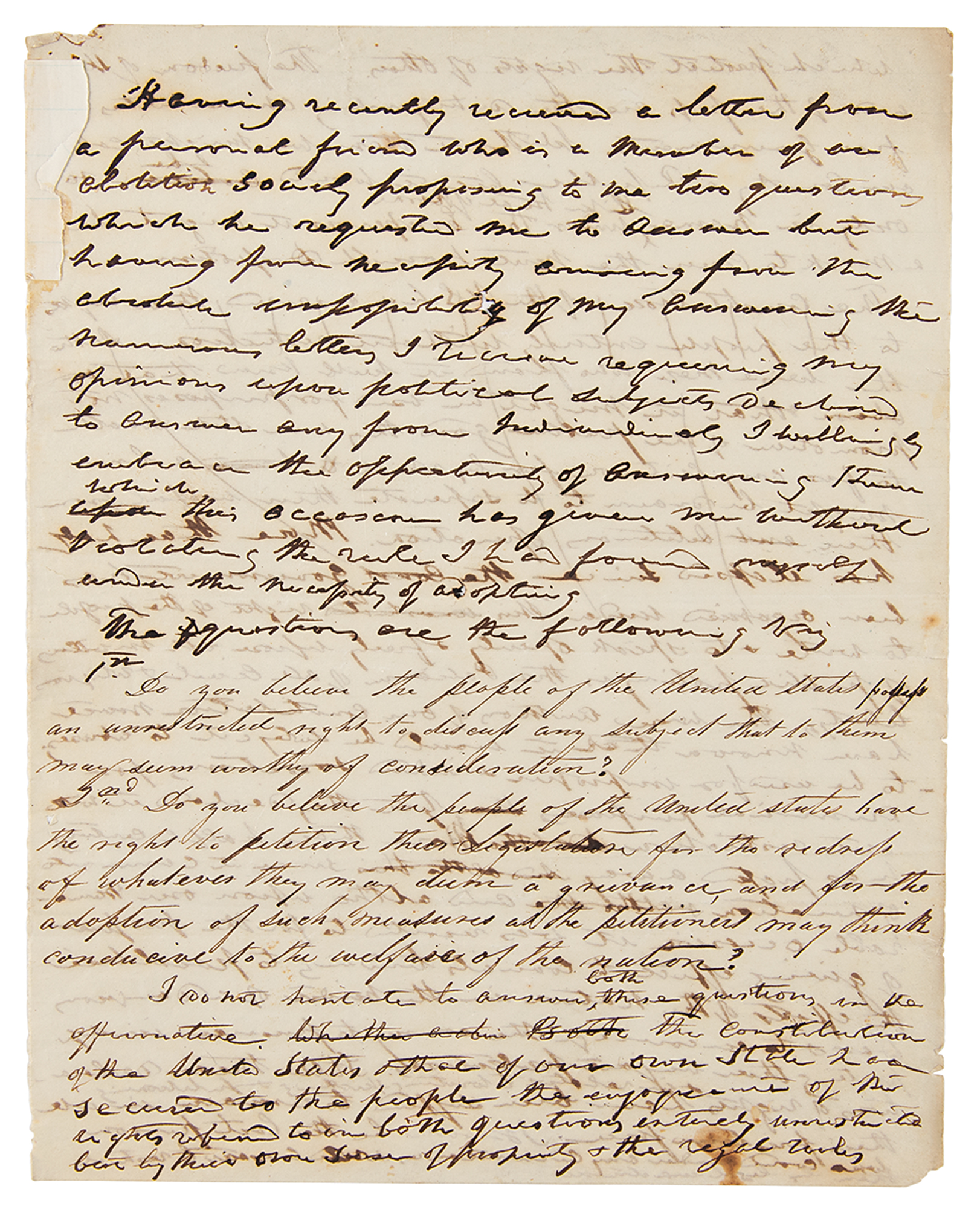 Important unsigned handwritten manuscript by William Henry Harrison, totaling four pages on three sheets, 8 x 10, no date but circa 1840. During his campaign for the presidency, Harrison drafts a careful response to questions posed to him by an abolitionist society, citing the United States Constitution while asserting states' rights. Harrison begins the manuscript, in part: "Having recently received a letter from a personal friend who is a member of an abolition society proposing to me two questions…I willingly embrace the opportunity of answering them." The two questions follow, penned neatly in another hand: "Do you believe the people of the United States possess an unrestricted right to discuss any subject that to them may seem worthy of consideration?…Do you believe the people of the United States have the right to petition their Legislature for the redress of whatever they may deem a grievance, and for the adoption of such measures as the petitioners may think conducive to the welfare of the nation?"