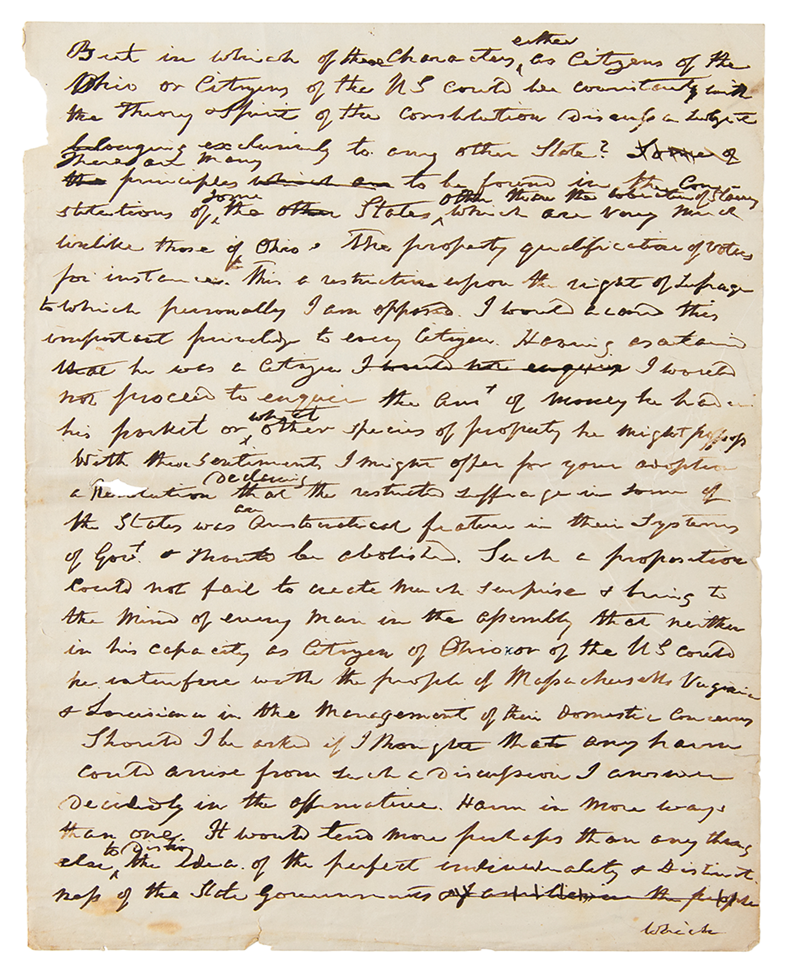 But in which of these characters either as citizens of the Ohio or citizens of the US, could we consistently with the theory and spirit of the Constitution discuss a subject belonging exclusively to any other State? There are many principles to be found in the Constitutions of some of the States, other than the toleration of slavery, which are very much unlike those of Ohio. The property qualification of voters for instance. This is a restriction upon the right of suffrage to which personally I am opposed, I would accord this important privilege to every citizen, I would not proceed to enquire the am't of money he had in his pocket, or what other specie of property he might possess. With these sentiments I might offer for your adoption a resolution declaring that the restricted suffrage in some of the States was an aristocratical feature in their systems of Gov't & should be abolished. Such a proposition could not fail to create much surprise & bring to the mind of every man in the assembly that neither in his capacity as a citizen of Ohio nor of the US, could he interfere with the people of Massachusetts, Virginia & Louisiana in the management of their domestic concerns. Should I be asked if I thought any harm could arrive from such a discussion I answer decidedly in the affirmative. Harm in more ways than one. It would tend more perhaps than anything else to destroy the idea of the perfect individuality & distinctness of the State governments which has been considered as one of the most important features in our system…which in the opinion of our wisest & best statesmen would be the immediate precursor of the downfall of liberty. It could not fail also to produce a state of unfriendly feeling between the people of the respective states which is the only effective bond of our union."