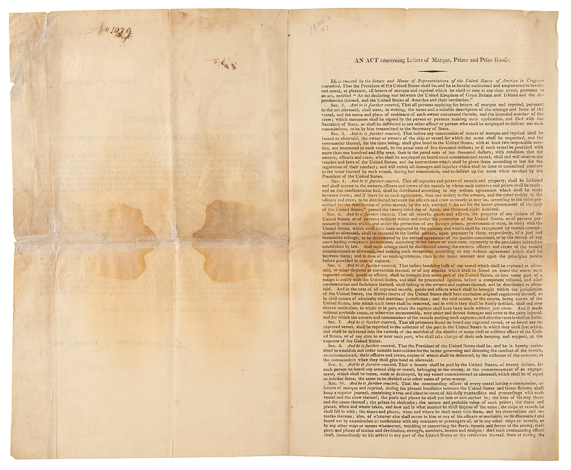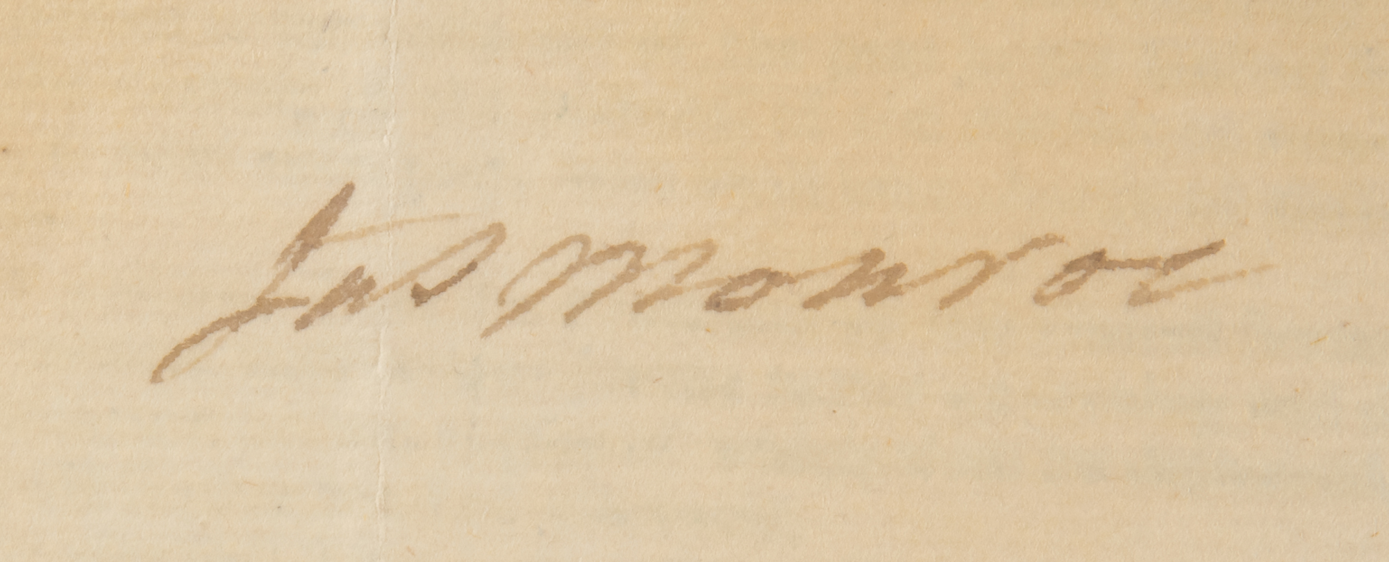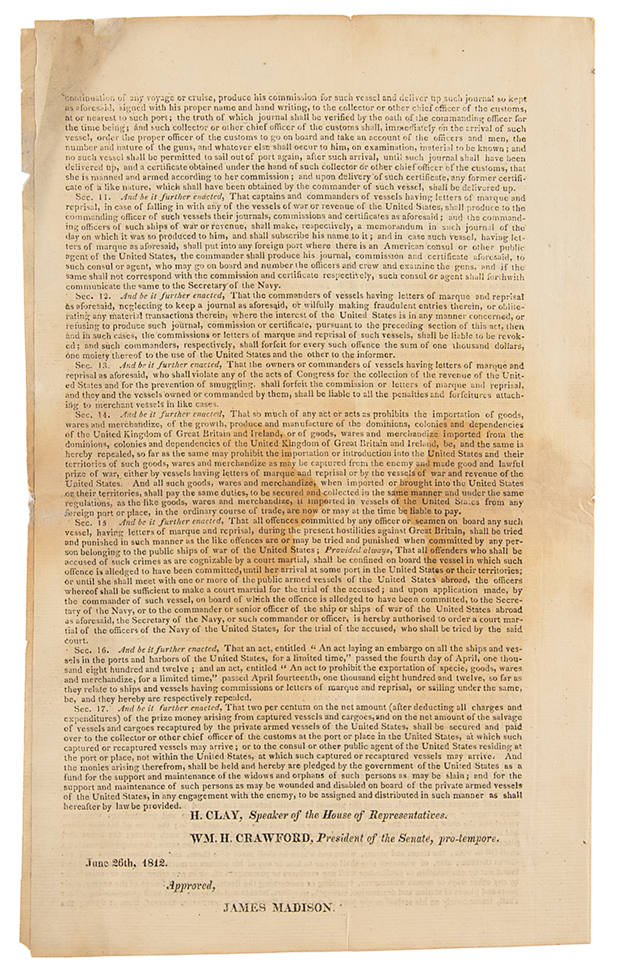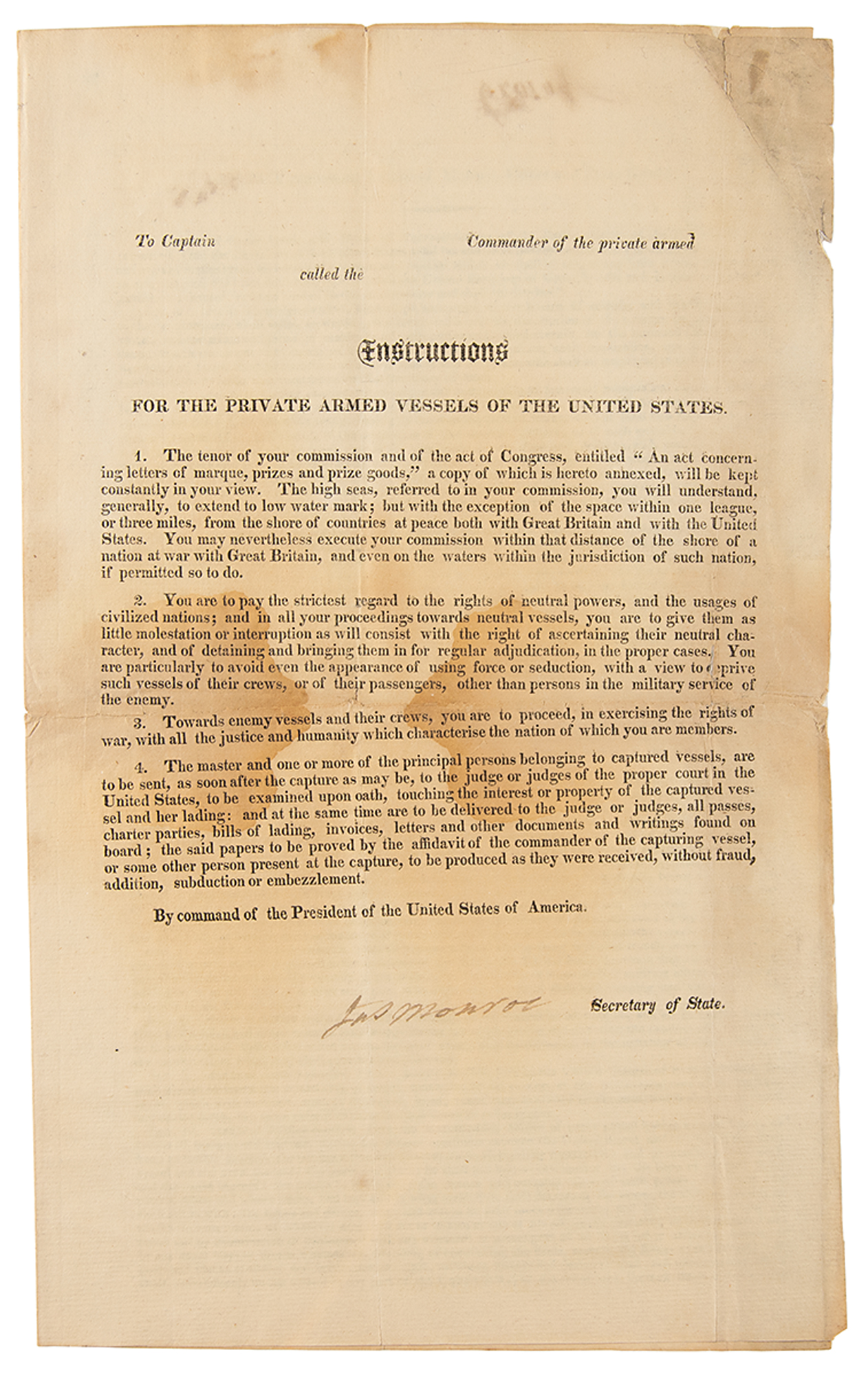 Partly-printed DS as Secretary of State, signed “Jas. Monroe,” three pages on two adjoining sheets, 7.75 x 12.75, June 26, 1812. Important privateering document issued at the beginning of the War of 1812, containing "Instructions for the Private Armed Vessels of the United States." The first sheet features the printed "Act concerning Letters of Marque, Prizes and Prize Goods," and the second has instructions to privateers. In part: "The high seas, referred to in your commission, you will understand, generally, to extend to low water mark…You are to pay the strictest regard to the rights of neutral powers, and the usages of civilized nations…Towards enemy vessels and their crews, you are to proceed, in exercising the rights of war, with all the justice and humanity which characterise the nation of which you are members…The master and one or more of the principal persons belonging to captured vessels, are to be sent, as soon after the capture as may be, to the judge or judges of the proper court in the United States." Neatly signed at the conclusion by Secretary of State James Monroe. In very good to fine condition, with scattered staining, and archival repairs to tears and fold splits.
