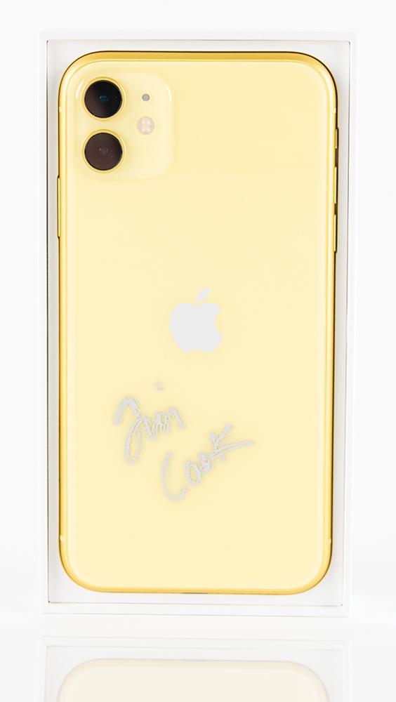 A yellow iPhone 11 by Apple Inc., signed on the case in silver ink by Apple CEO Tim Cook. Includes the original iPhone 11 case. In very fine condition, with slight irregular ink adhesion.
