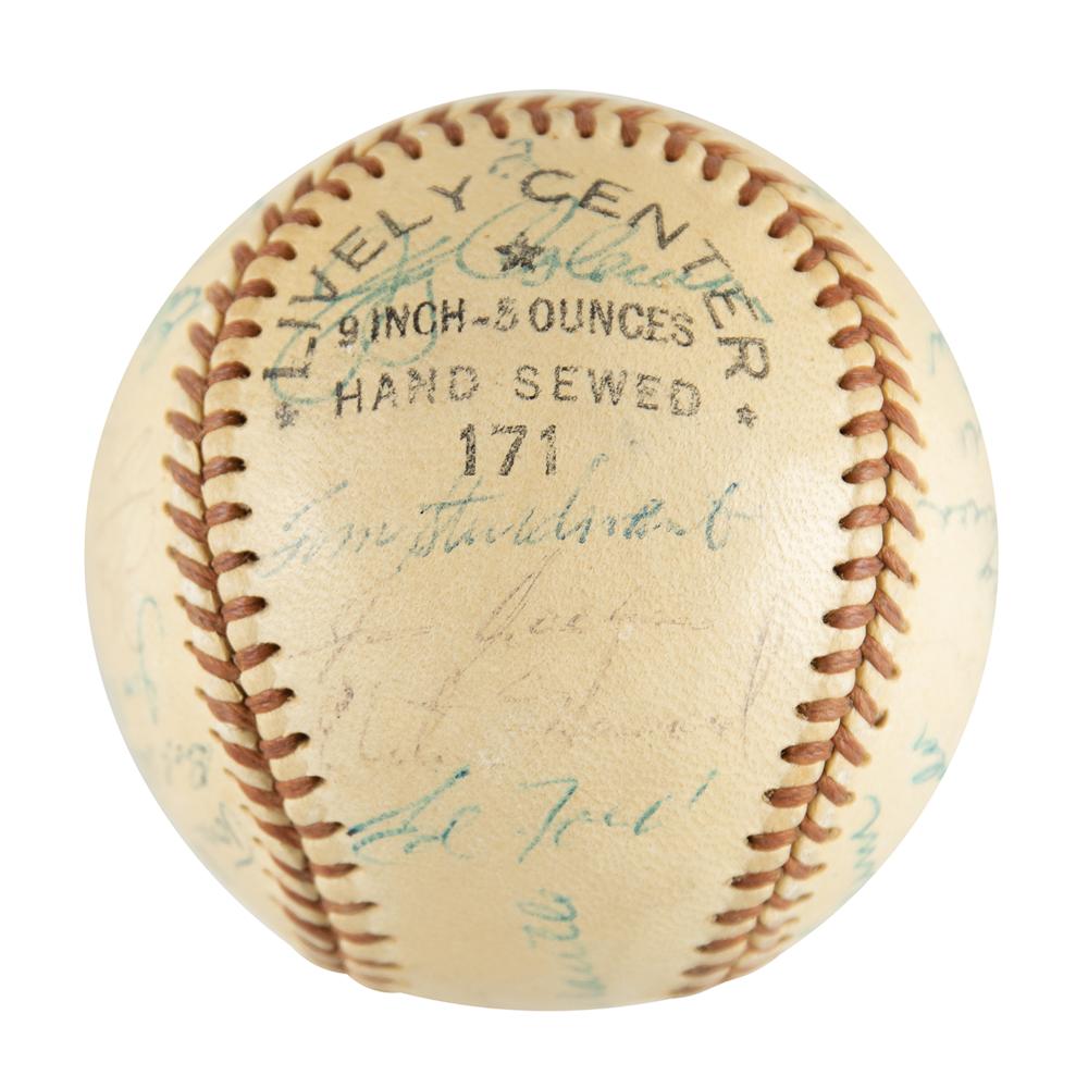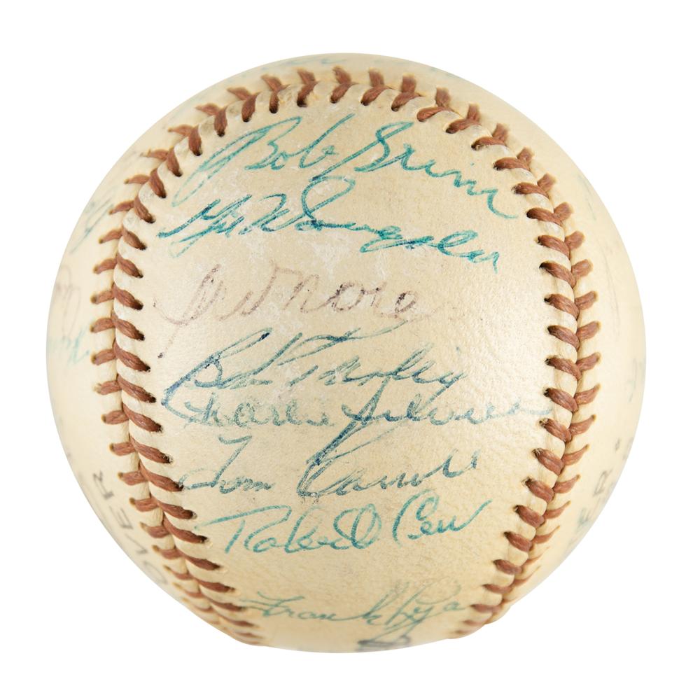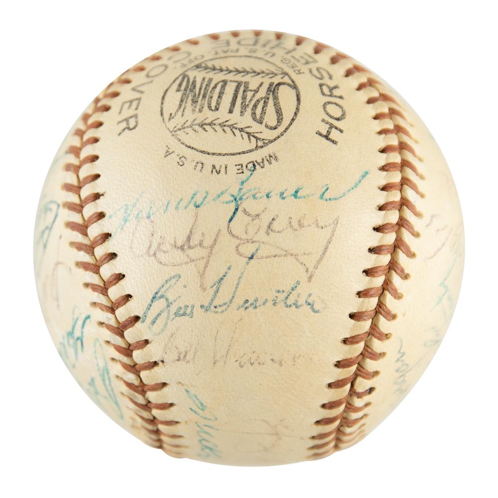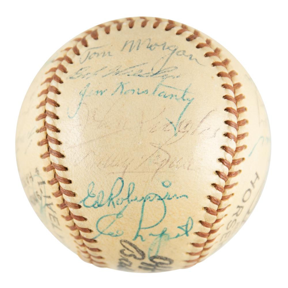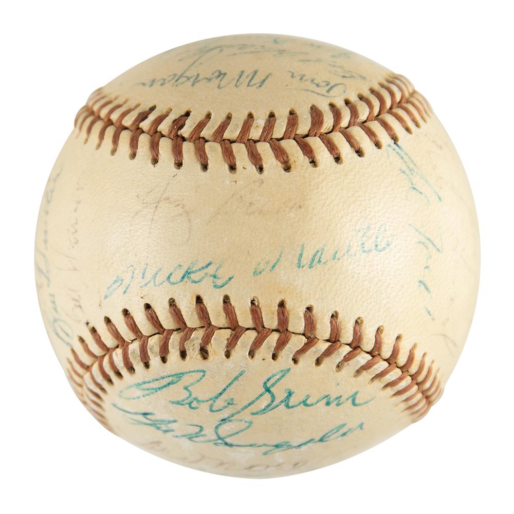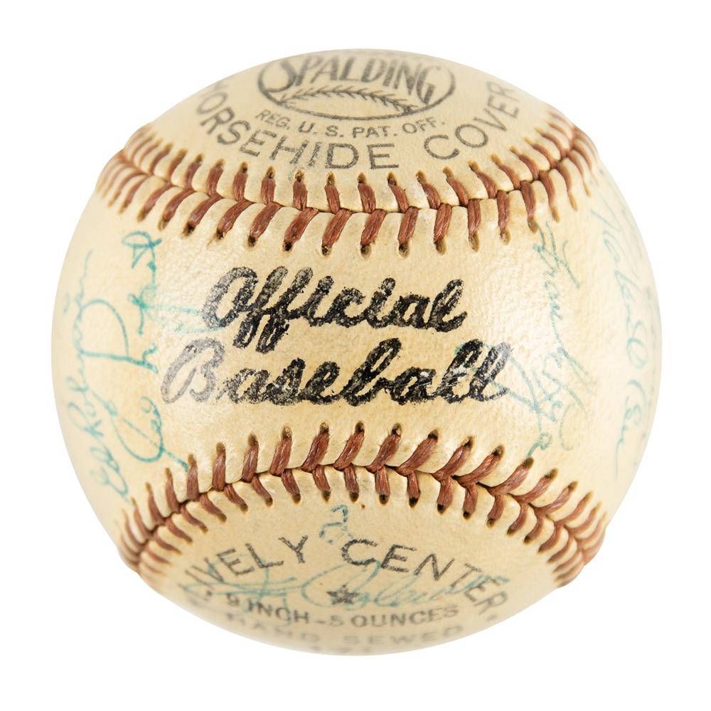 Spalding 'Official' baseball signed in ballpoint on the sweet spot and side panels by 26 members of the 1955 pennant-winning New York Yankees squad, including: Mickey Mantle (ss), Yogi Berra (ss), Whitey Ford, Hank Bauer, Andy Carey, Bill Hunter, Bill Skowron, Jerry Coleman, Tom Sturdivant, Joe Collins, Elston Howard, Tom Morgan, Bob Wiesler, Jim Konstanty, Johnny Kucks, Ed Robinson, Ed Lopat, Bob Grim, Gil McDougald, Irv Noren, Bob Turley, Charlie Silvera, Bob Cerv, Frank Leja, and others. In fine condition, with fading to Berra, Howard, and some of the lesser names.