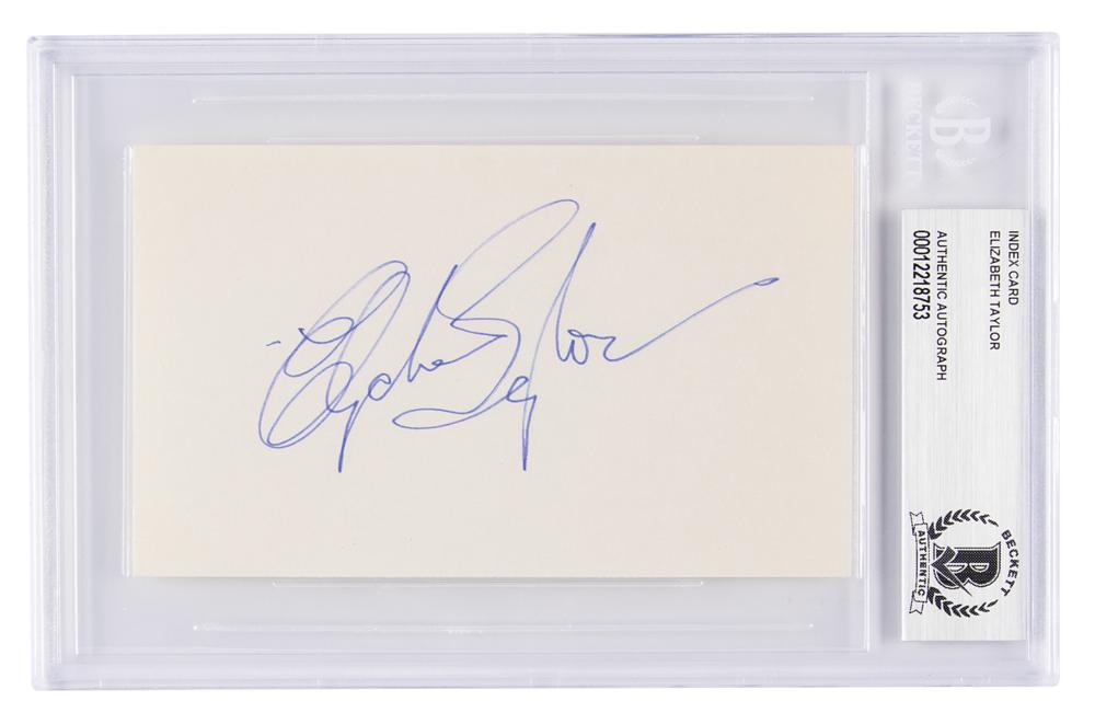Felt tip signature, "Elizabeth Taylor,” on an off-white 5 x 3 card. In very fine condition. Encapsulated in a Beckett authentication holder.