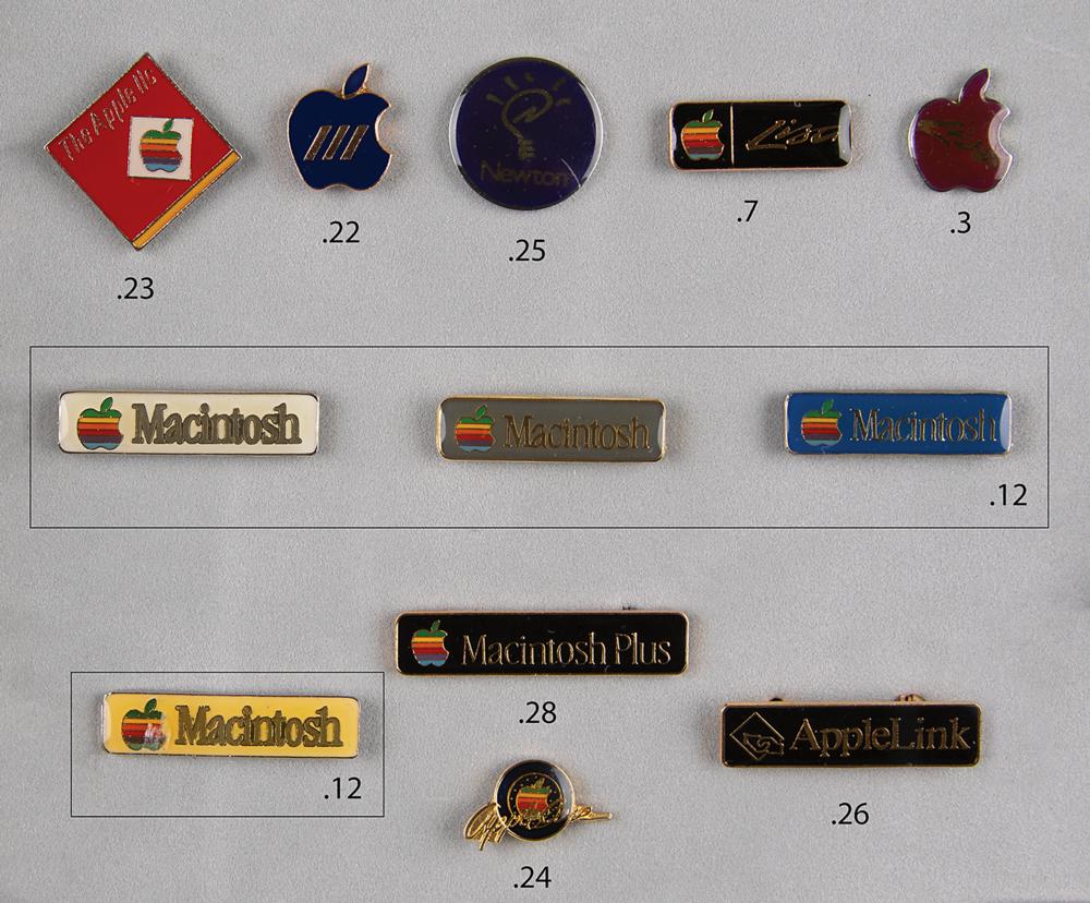 12. Set of four Macintosh pins with Apple rainbow logos; the white background pin was sold in Apple’s 1986 Gift Catalog and came in pin and broach versions; the gray and blue background pins were prototypes made by International Datawares.