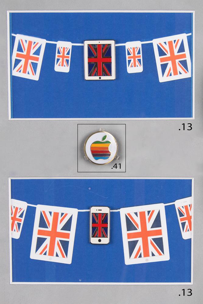 13. Two iPad and iPhone UK pins with central Union Jack imagery; these pins could only be obtained in London at an Apple Computer Store during the 2012 Summer Olympics.