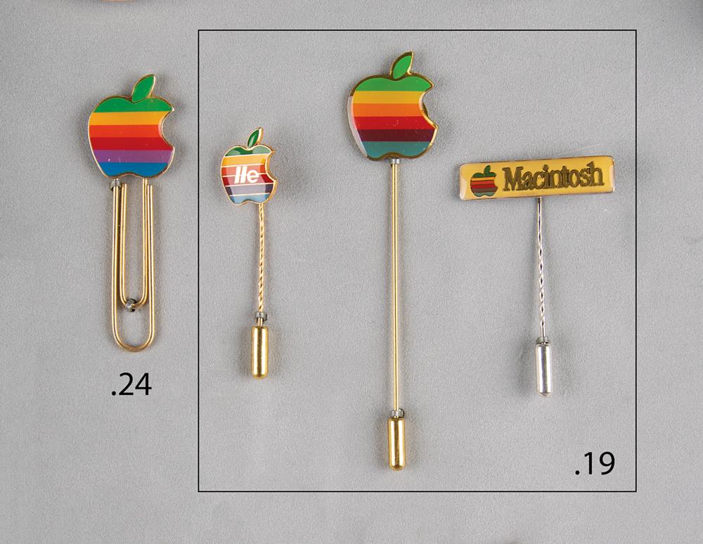19. Three Apple rainbow and Macintosh logo stickpins, all of which are prototypes made by International Datawares.