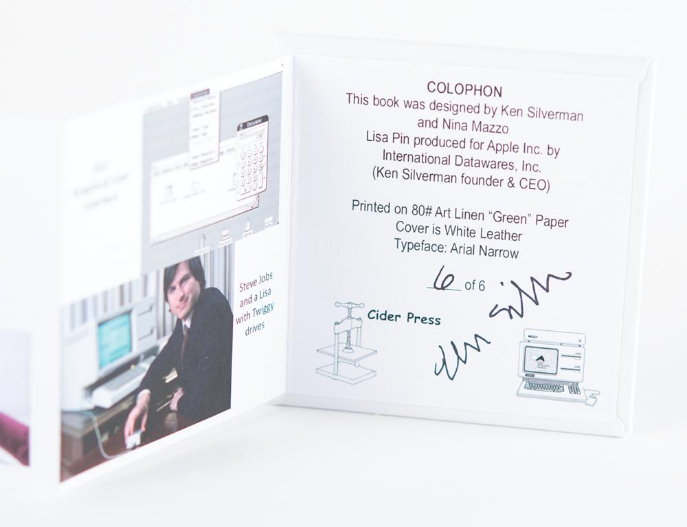 A limited edition miniature hardcover book about the Lisa computer, numbered 6/6 and produced by Cider Press as a limited printing for the miniature book society. The 3-inch book contains 10 pages of historical information on the Lisa (and the offered Lisa pin) with photos and technical specifications. The book is printed accordion-style with white leatherette boards that close with a gentle snap, and the back cover bears an affixed commissioned limited edition enamel Apple logo from circa 1977.