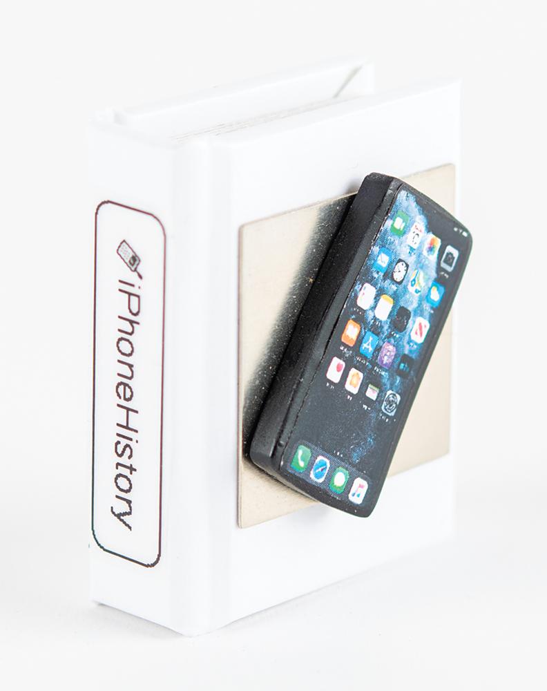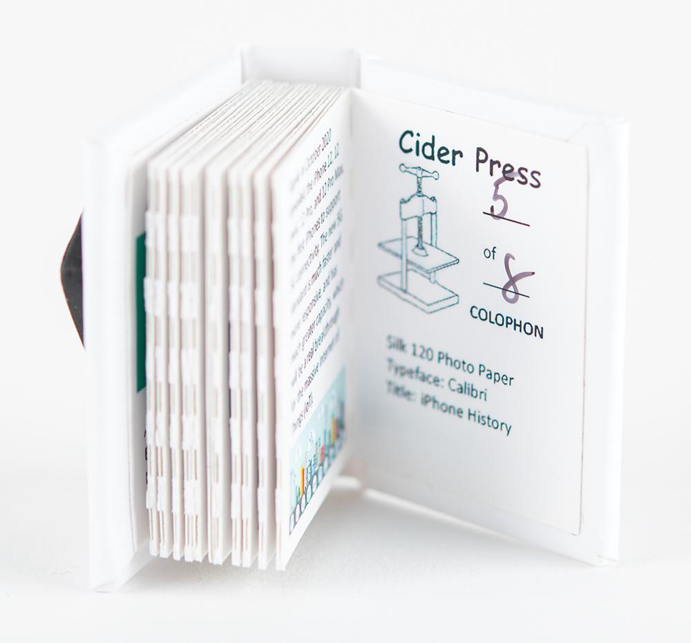 A limited edition miniature hardcover book on the history of the iPhone, numbered 5/8, 24 pages, 1.5″ x 1.75″, published in 2021 by the Cider Press. Bound with white leatherette, the book shows the evolution of the iPhone from the first-generation iPhone (announced by then-Apple CEO Steve Jobs on January 9, 2007) to the iPhone 12. A small replica iPhone is affixed to the front cover.