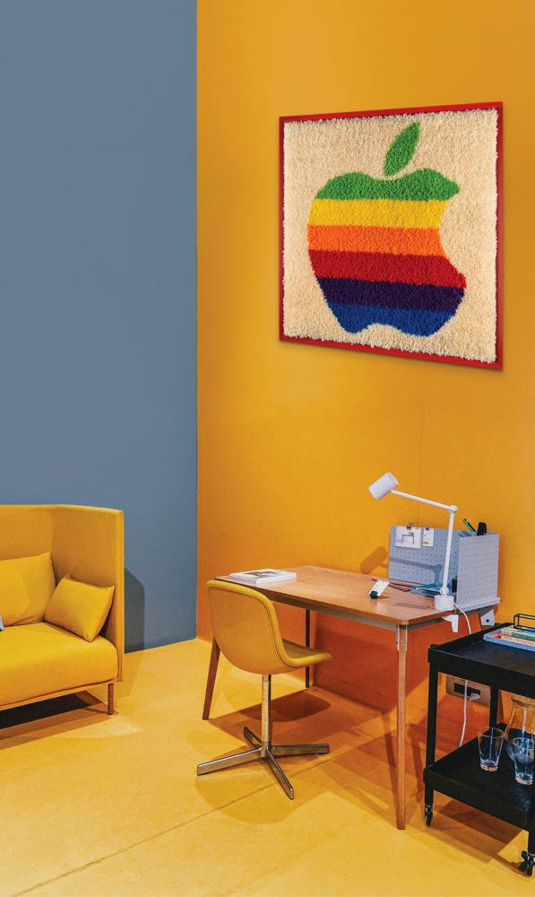 The consignor notes that this Apple rug originates from Alpha Computers of Richland, a computer shop in Richland, Washington, that was owned by her father in the early 1980s. The store specialized in Apple computer products and provided customers with repair services as well as hands-on computer training. This wall-hanging rug was displayed proudly behind the store's front counter.
