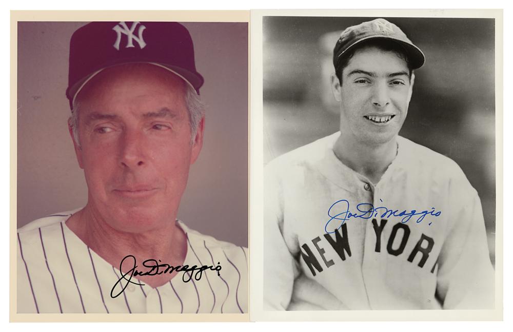 Two glossy 8 x 10 photos of Joe DiMaggio with the New York Yankees at the start and at end of his illustrious baseball career, individually signed in blue and black felt tip by ‘The Yankee Clipper.’ In fine condition.