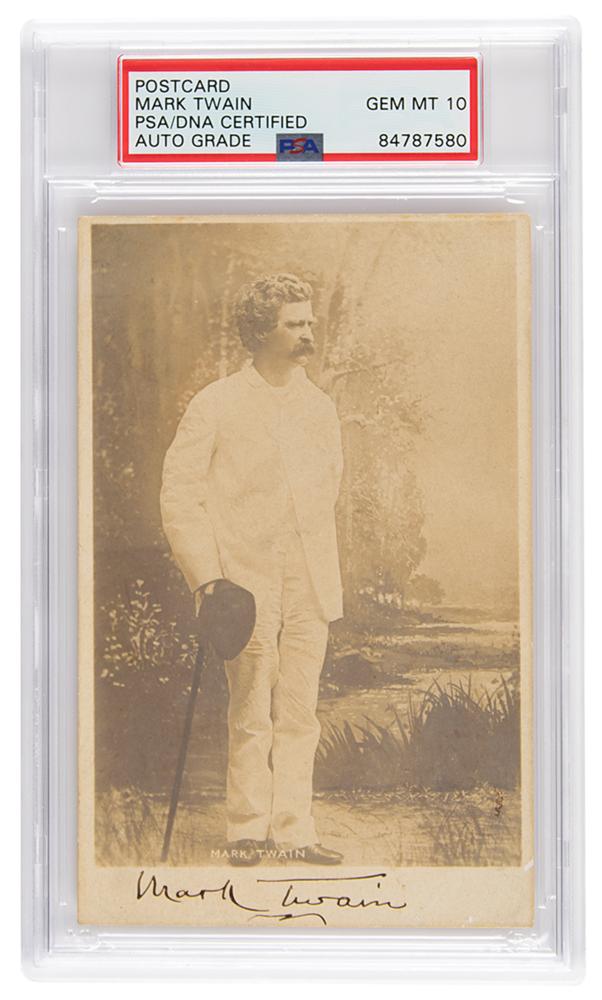 Superb vintage matte-finish 3.5 x 5.25 postcard photo of Samuel L. Clemens in a full-length pose standing outdoors and clad in his trademark white suit, signed in the lower border in black ink with his famous pen name, "Mark Twain." In fine condition. Accompanied by a certificate of authenticity from University Archives. Encapsulated and graded by PSA/DNA as "GEM MT 10."