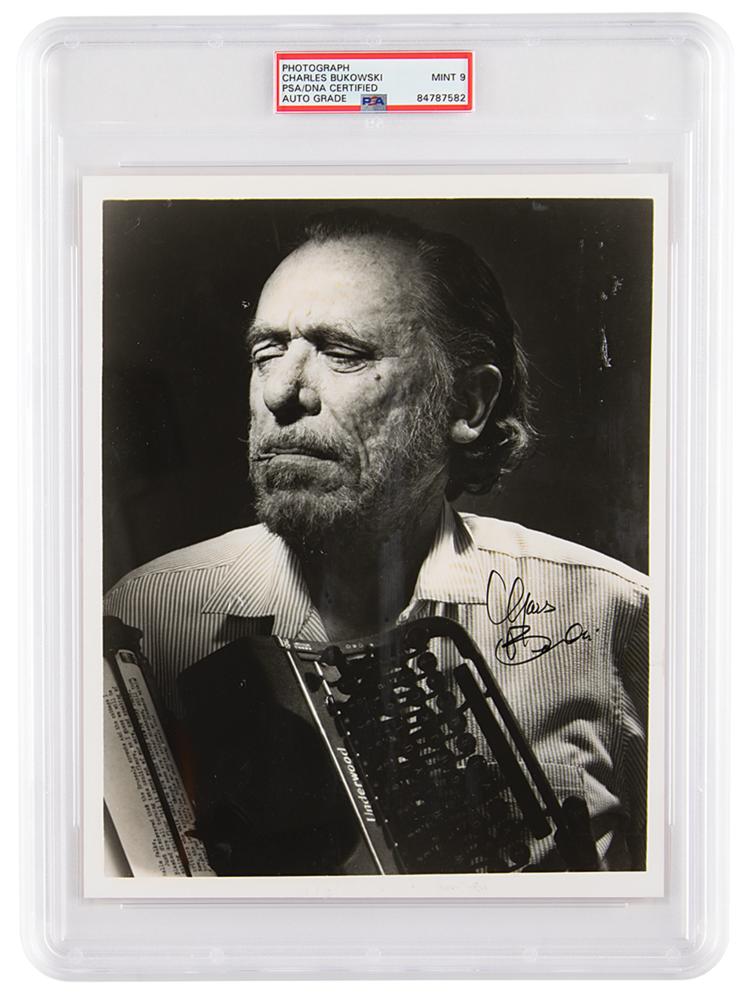 Glossy 8 x 10 photo of Charles Bukowski smoking and holding an Underwood typewriter, signed in black felt tip, "Chas. Bukowski." In fine condition. Encapsulated and graded by PSA/DNA as "MINT 9."