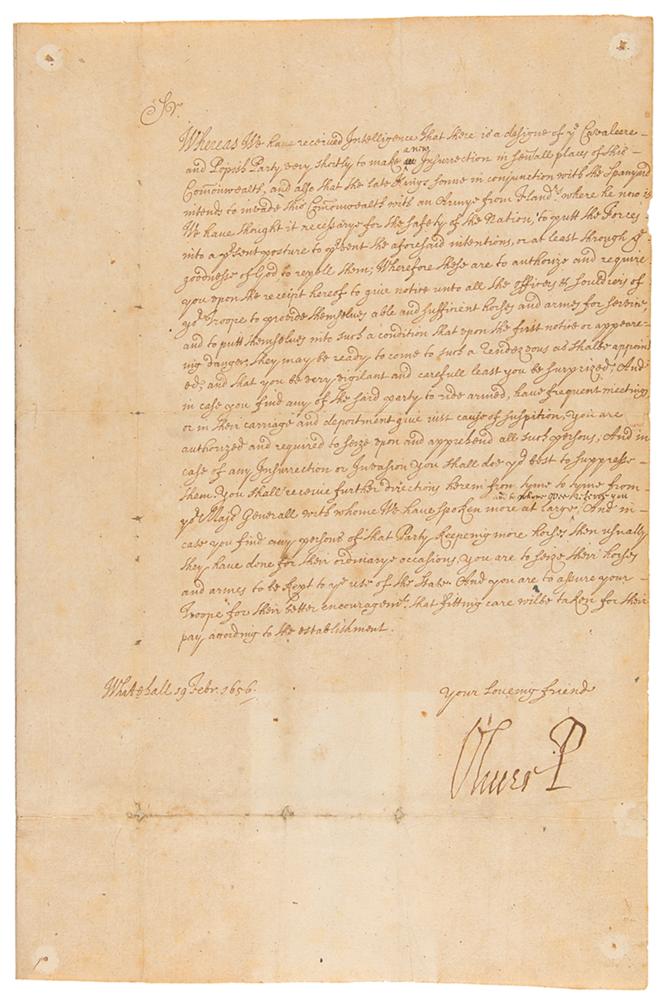 English soldier and statesman (1599-1658) who led Parliamentary forces in the English Civil War, waged war against Scotland and Ireland and, in 1653, following the execution of Charles I, became Lord Protector of Great Britain, a position he held until his death in 1658. After a yearlong reign by his son, Richard, the British throne was restored (to Charles II) and Cromwell's body was exhumed and posthumously 'executed.' LS signed “Oliver P,” one page, 9 x 13.75, February 19, 1656. Important military letter from Whitehall, signed by Oliver Cromwell as Lord Protector. In full: "Whereas we have received intelligence that there is a design by the Cavalier and Popish party very shortly to make a new insurrection in several places of this Commonwealth, and also that the late King's son, in conjunction with the Spaniard, intends to invade this Commonwealth with an army from Flanders where he now is, We have thought it necessary for the safety of the nation to put the forces into a present posture to prevent the aforesaid intention, or at least through the Goodness of God, to repel them.