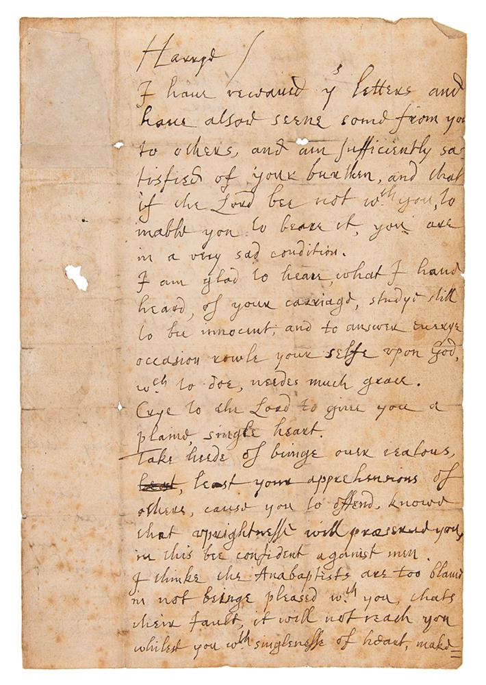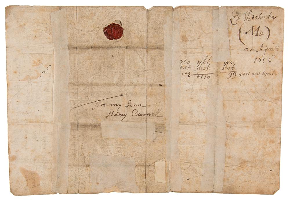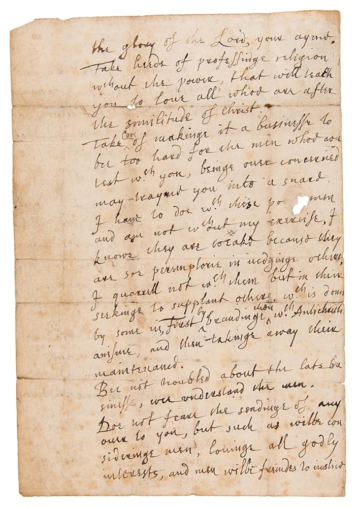 English soldier and statesman (1599-1658) who led Parliamentary forces in the English Civil War, waged war against Scotland and Ireland and, in 1653, following the execution of Charles I, became Lord Protector of Great Britain, a position he held until his death in 1658. After a yearlong reign by his son, Richard, the British throne was restored (to Charles II) and Cromwell's body was exhumed and posthumously 'executed.' ALS signed “Oliver P,” three pages on two sheets, 8 x 11.75, August 21, 1656. Handwritten letter to his son, Henry Cromwell, giving him fatherly advice and expressing his opinion of the Anabaptists. In part: "Crye to the Lord to give you a plaine, single heart. Take heede of beinge over jealous, lest your apprehensions of others, cause you to offend, knowe that uprightness will praeserve you, in this bee confident against men. I thinke the Anabaptists are too blame in not beinge pleased with you, thats their fault, it will not reach you whilest you wth singlenesse of heart, make the glory of the Lord, your ayme. Take heede of professinge religion wthout the power, that will teach you to love all whoe are after the similitude of Christ. Take care of makinge it a businisse to bee too hard for the men whoe contest wth you, beinge over concerned may trayne you into a snare. I have to doe wth these poor men and am not wthout my exercise?Doe not feare the sendinge of any over to you, but such as wilbe consideringe men, lovinge all godly interests, and men wilbe friendes to justice. Lastlye take heede of studyinge to lay for your selfe ye foundation of a great estate. It wilbe a snare to you, they will watch you, bad men wilbe confimed in courteousnesse, the thinge is an evil wch God abhorrs, I pray you thinke of mee in this. If the Lord did not sustaine mee I were undon, but I live, and I shall live, in the pleasure of his grace." Addressed on the reverse, "For my sonn Harry Cromwell." In very good condition, with moderately heavy foxing and soiling, old repairs to some of the fold splits, and a small area of seal-related paper loss. Autograph letters by Oliver Cromwell are extremely scarce, particularly those that reveal his tender side—in this case, he offers warm, loving advice to his 28-year-old son.