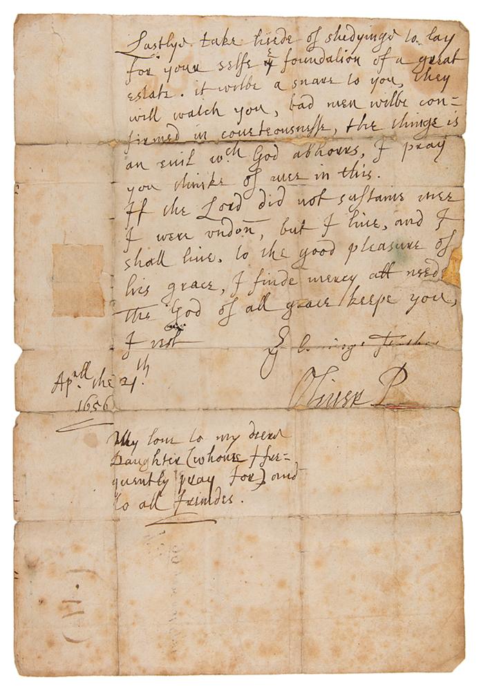 Fatherly advice from Oliver Cromwell in a rare handwritten letter: "Take heede of beinge over jealous, lest your apprehensions of others, cause you to offend"
