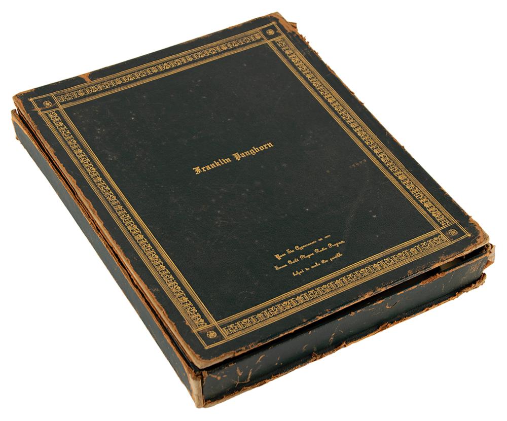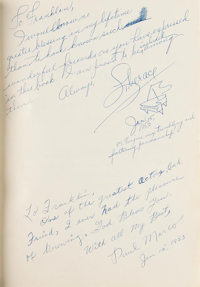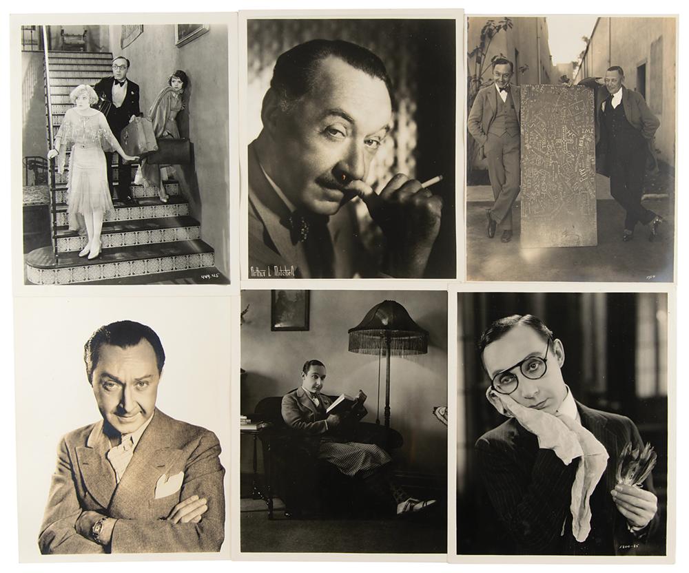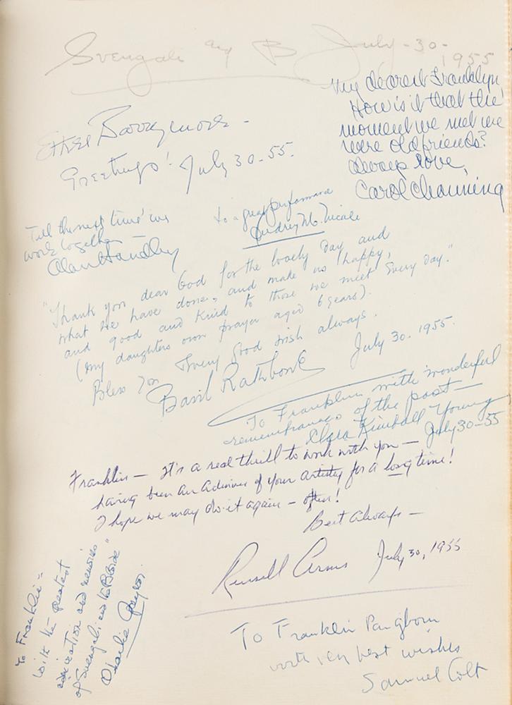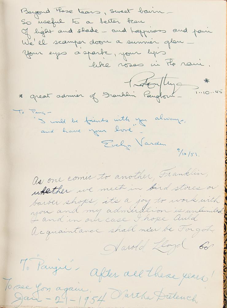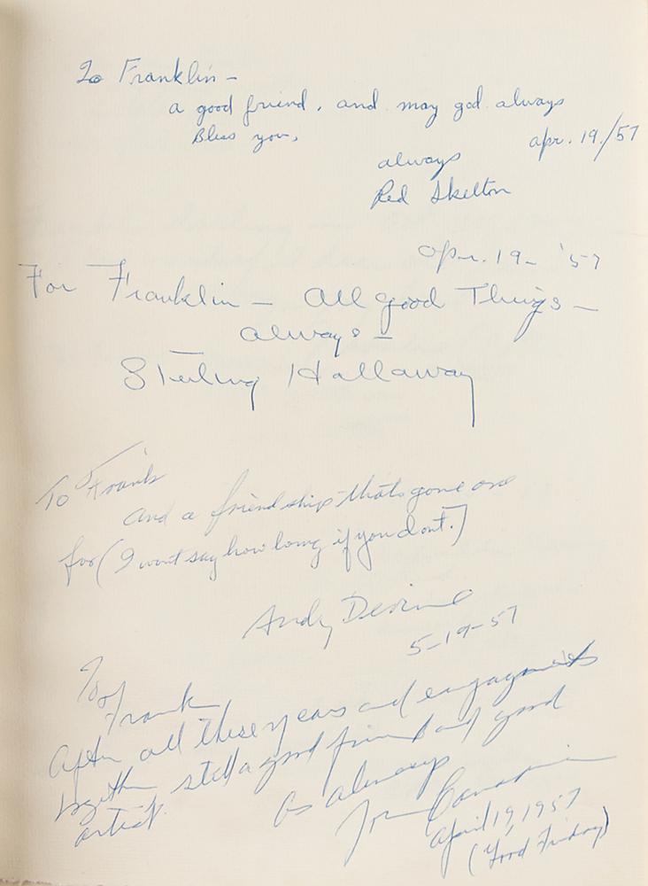 Archive from the personal collection of prolific comedic character actor Franklin Pangborn (1889-1958), a genre pioneer who appeared in over 200 films throughout his career and, while rarely a lead actor, capitalized on his brief screen time with his distinctive comic persona. The archive includes several letters and telegrams sent to Pangborn, a large variety of candid, vintage, publicity, and studio photographs, a short handwritten summary of his early stage career, theater programs, newspaper clippings, 14-inch reel-to-reel tapes, documents, and more. The highlight of the archive is Pangborn’s leather-bound guestbook presented to him by the Motion Picture Relief Fund, 10 x 13, with the illuminated opening page reading: “Franklin Pangborn, In appreciation of your fifth appearance on our Screen Guild Players radio program, February 19, 1945.” The guestbook contains over 300 signatures of family, friends, and fellow actors and filmmakers between 1945 and 1957, which includes the following highlights: Preston Sturges, Harold Lloyd, Mack Sennett, Billie Burke, Basil Rathbone, John Carradine, Greer Garson, Sid Grauman, Ethel Barrymore, Carol Channing, Red Skelton, Victor McLaglen, Ramon Novarro, Liberace, Alla Nazimova, Dolores del Rio, Evelyn Varden, Jane Darwell, Jean Hersholt, Shirley Booth, Louise Fazenda, Ann Sothern, Ernest Truex, Andy Clyde, Del Lord (rare), Hal Smith, Bea Benaderet, Edward Everett Horton, Sterling Holloway, Andy Devine, and many more. The guestbook includes its original presentation case, which bears considerable wear. Additionally, of the archive’s approximately 60 photographs, nearly half are vintage publicity variants spanning Pangborn’s lengthy career, and seven photos are either signed or annotated by Pangborn. In overall very good to fine condition, with rusting and wear to the reels, which contain a musty odor and are very likely incapable of being played. A delightfully diverse archive rife with visual interest and notable autographs of classic Hollywood film stars, many of whom are quite rare.