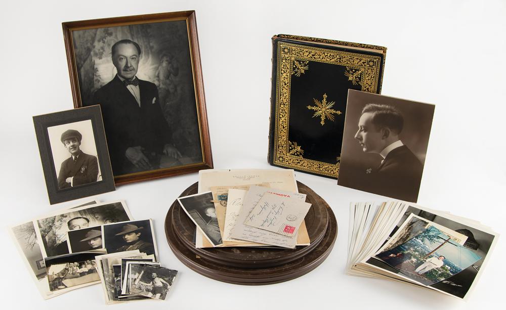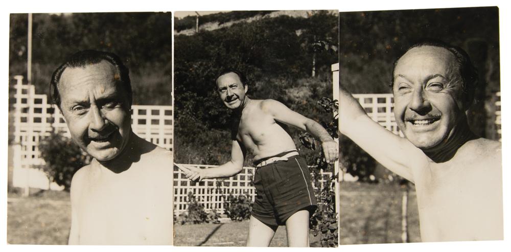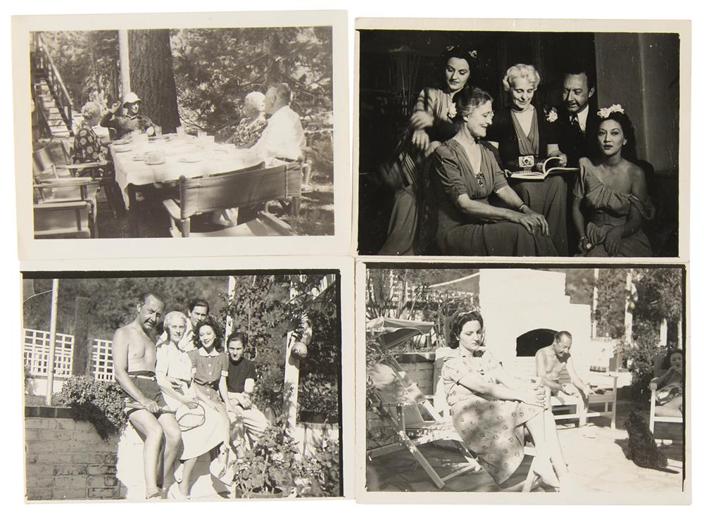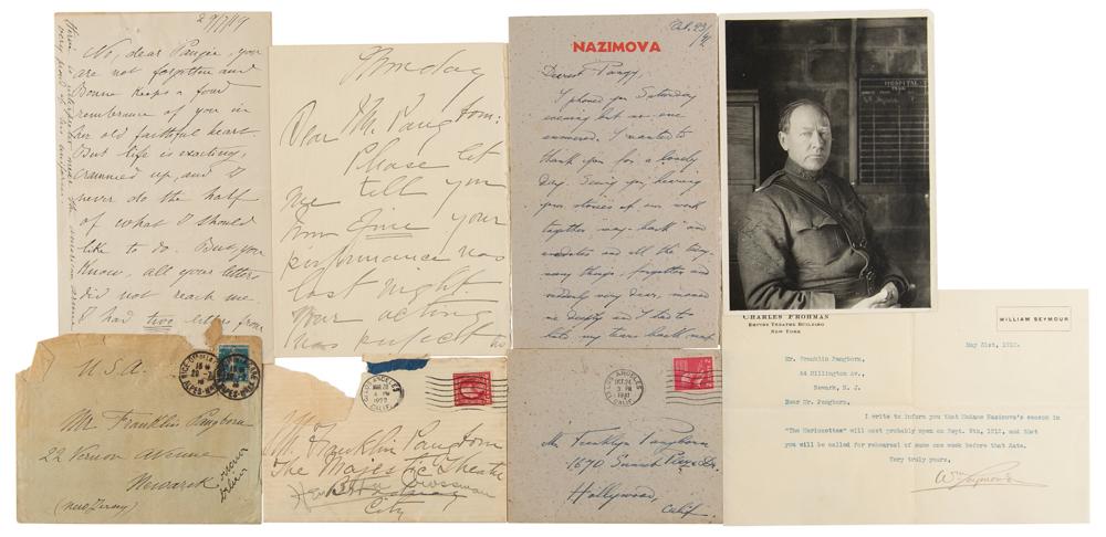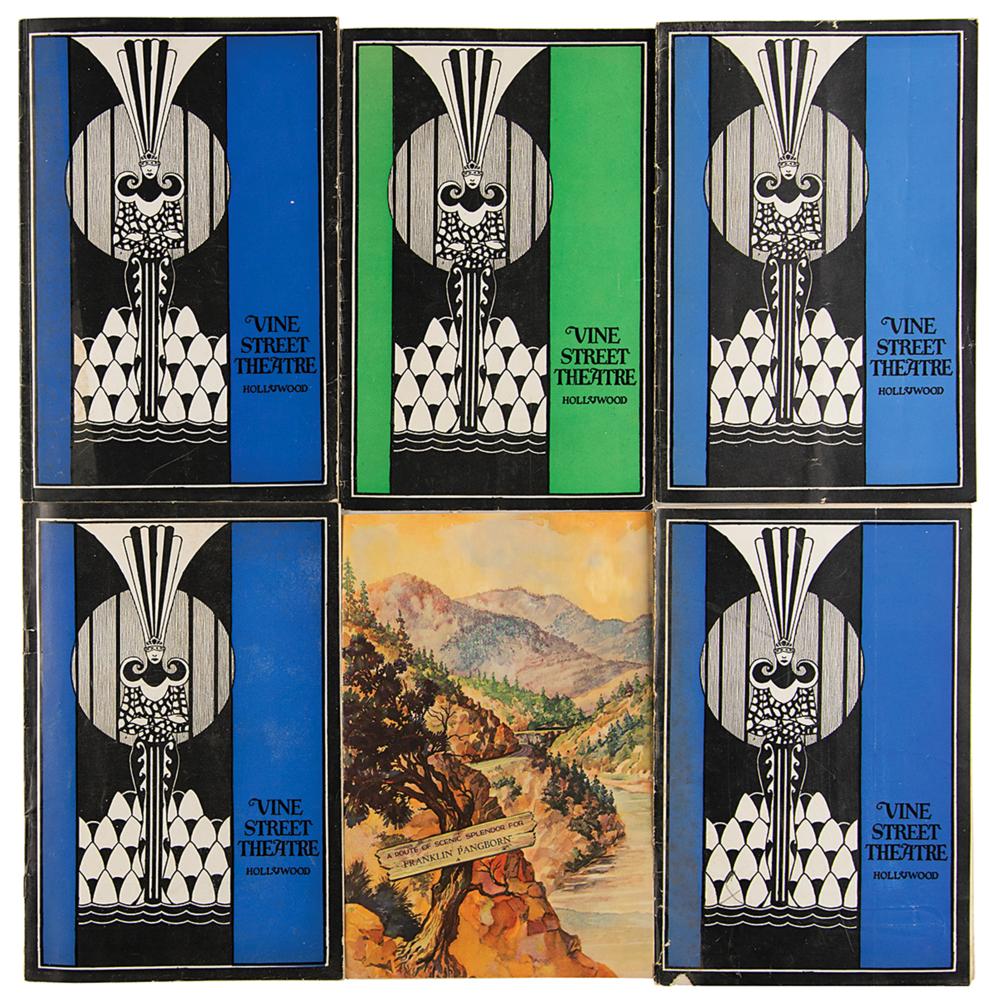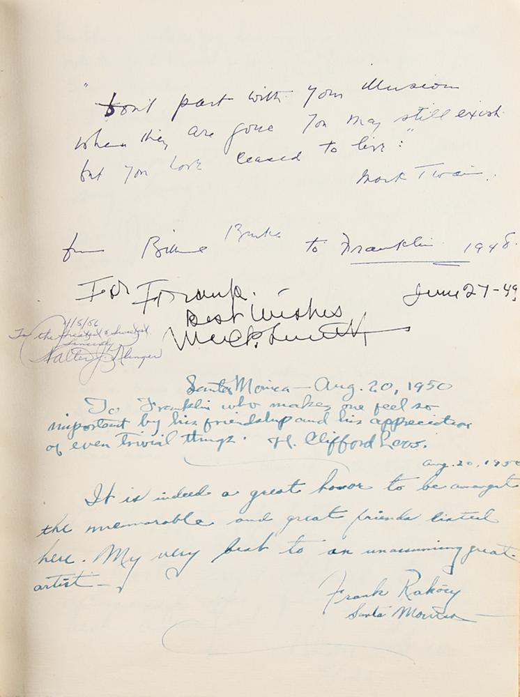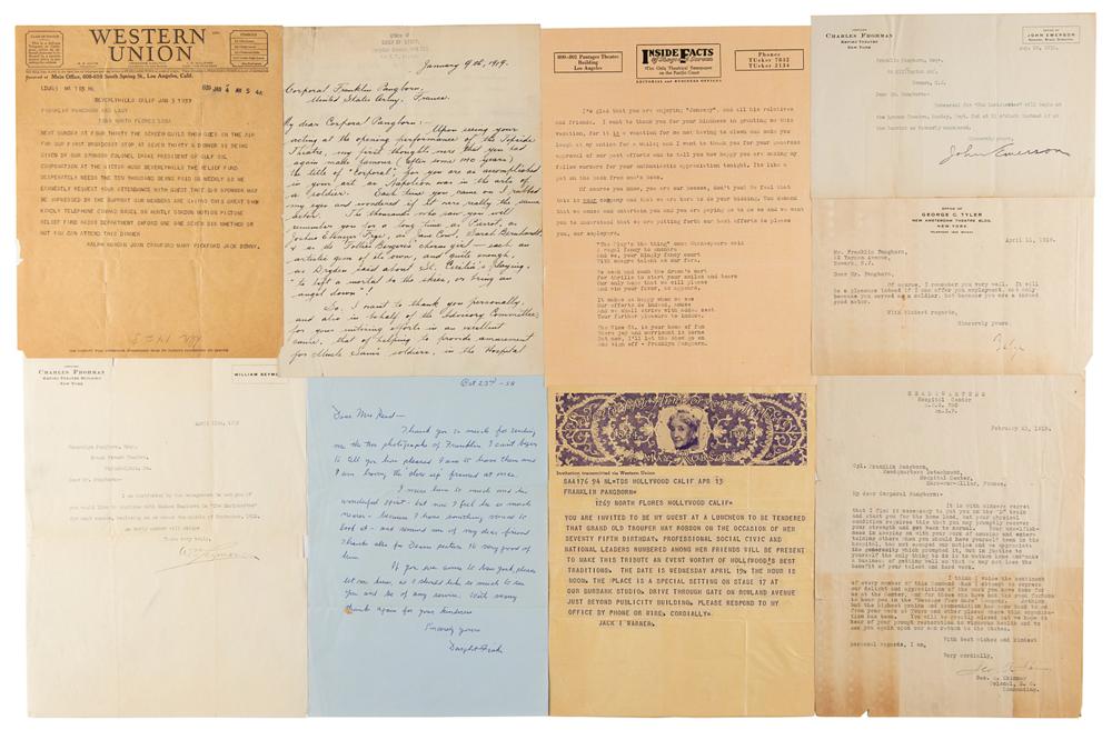 Archive from the personal collection of prolific comedic character actor Franklin Pangborn (1889-1958), a genre pioneer who appeared in over 200 films throughout his career and, while rarely a lead actor, capitalized on his brief screen time with his distinctive comic persona. The archive includes several letters and telegrams sent to Pangborn, a large variety of candid, vintage, publicity, and studio photographs, a short handwritten summary of his early stage career, theater programs, newspaper clippings, 14-inch reel-to-reel tapes, documents, and more. The highlight of the archive is Pangborn’s leather-bound guestbook presented to him by the Motion Picture Relief Fund, 10 x 13, with the illuminated opening page reading: “Franklin Pangborn, In appreciation of your fifth appearance on our Screen Guild Players radio program, February 19, 1945.” The guestbook contains over 300 signatures of family, friends, and fellow actors and filmmakers between 1945 and 1957, which includes the following highlights: Preston Sturges, Harold Lloyd, Mack Sennett, Billie Burke, Basil Rathbone, John Carradine, Greer Garson, Sid Grauman, Ethel Barrymore, Carol Channing, Red Skelton, Victor McLaglen, Ramon Novarro, Liberace, Alla Nazimova, Dolores del Rio, Evelyn Varden, Jane Darwell, Jean Hersholt, Shirley Booth, Louise Fazenda, Ann Sothern, Ernest Truex, Andy Clyde, Del Lord (rare), Hal Smith, Bea Benaderet, Edward Everett Horton, Sterling Holloway, Andy Devine, and many more. The guestbook includes its original presentation case, which bears considerable wear. Additionally, of the archive’s approximately 60 photographs, nearly half are vintage publicity variants spanning Pangborn’s lengthy career, and seven photos are either signed or annotated by Pangborn. In overall very good to fine condition, with rusting and wear to the reels, which contain a musty odor and are very likely incapable of being played. A delightfully diverse archive rife with visual interest and notable autographs of classic Hollywood film stars, many of whom are quite rare.