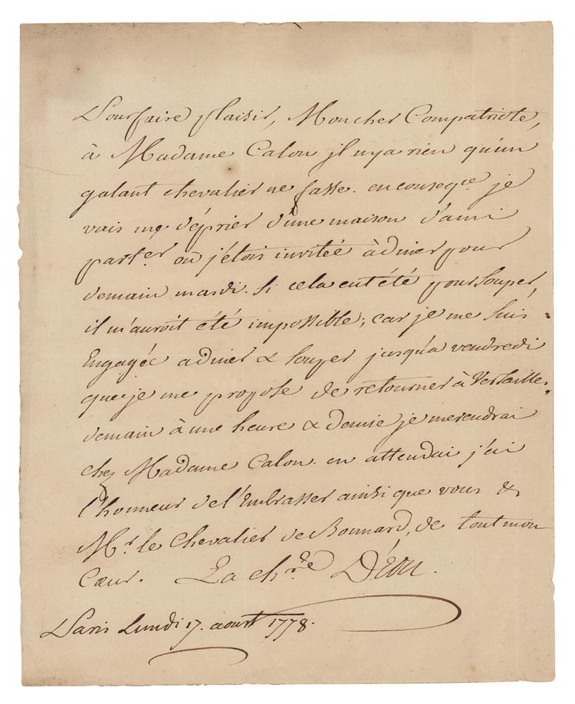 French diplomat, spy and soldier (1728-1810) whose first 49 years were spent as a man, and whose last 33 years were spent as a woman. Rare ALS in French, signed with the feminine form of the name, “La Chre D’Eon,” one page, 7.25 x 9, August 17, 1778. An untranslated and neatly penned handwritten letter from d'Éon. In fine condition, with a short tear to the left edge.