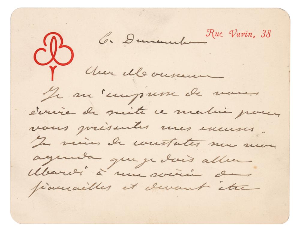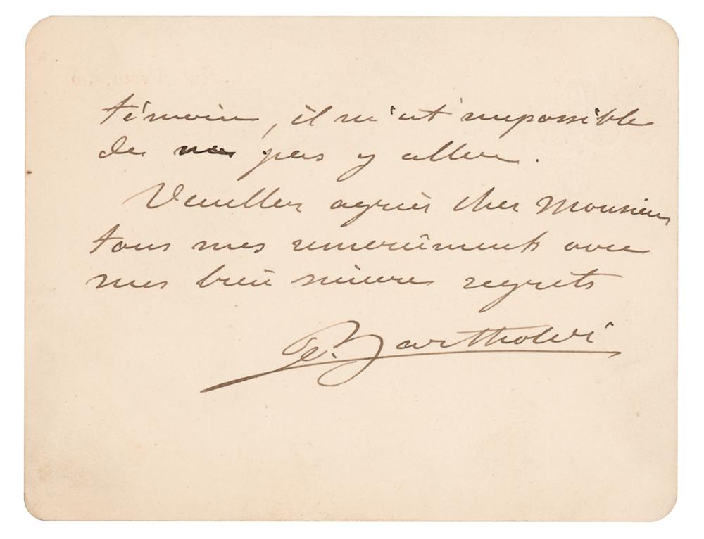 Eminent French sculptor (1834-1904) best known for designing the Statue of Liberty. ALS in French, signed “Bartholdi,” one page both sides, 4.5 x 3.5, personal stationery card, December 6 [no year]. An untranslated and neatly penned handwritten letter from Frédéric Auguste Bartholdi, who is apparently declining an invitation. In fine condition.